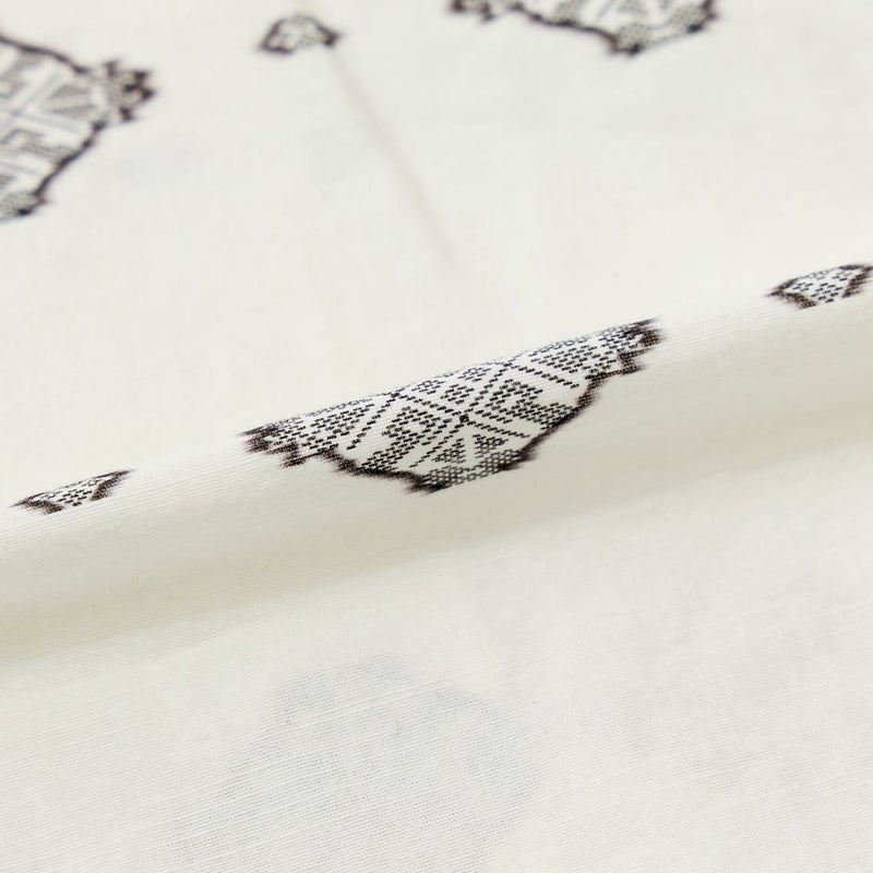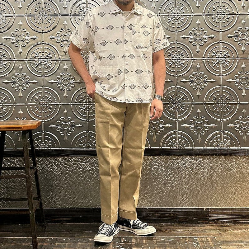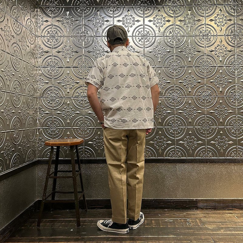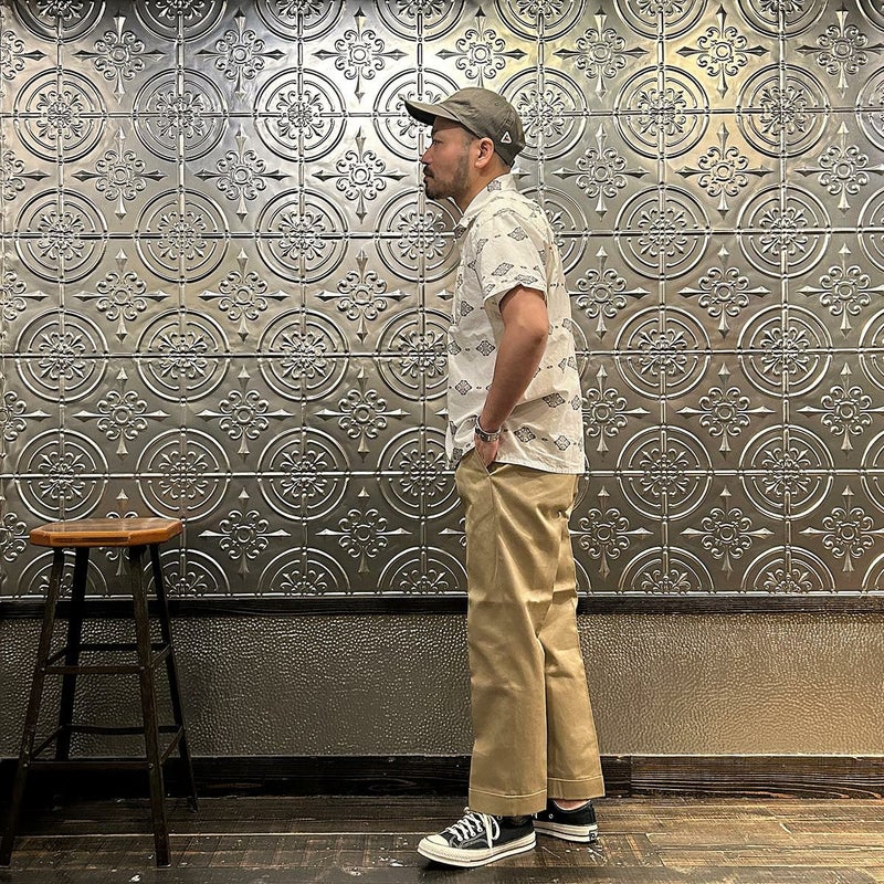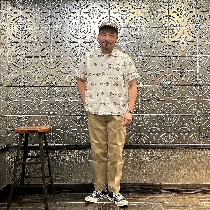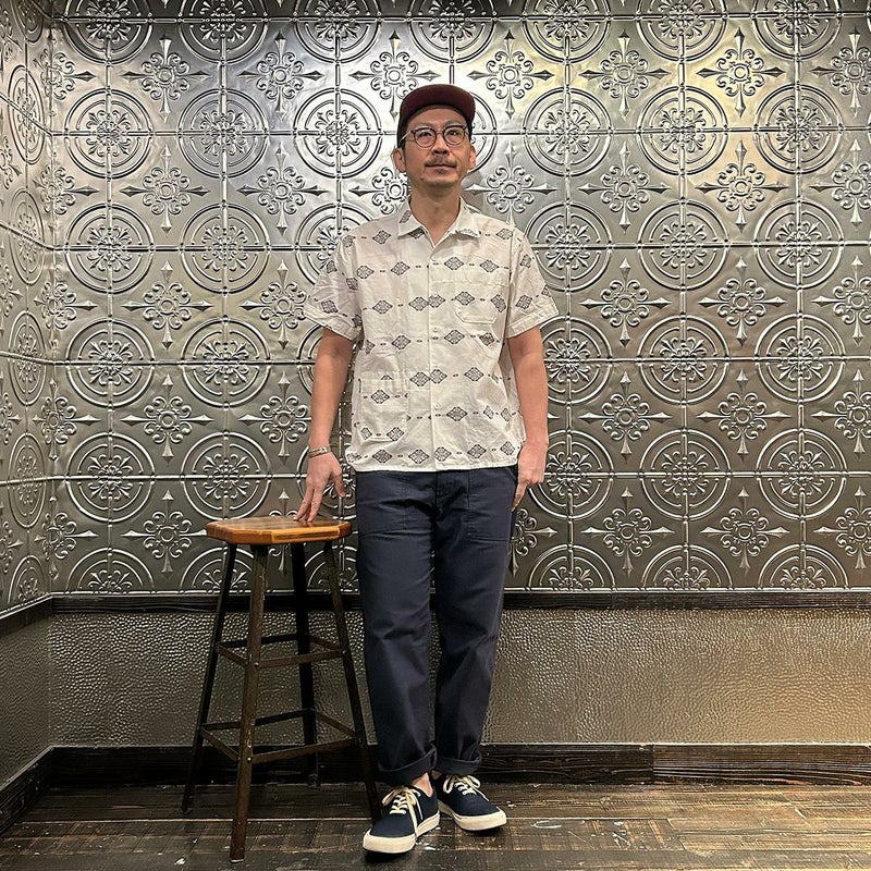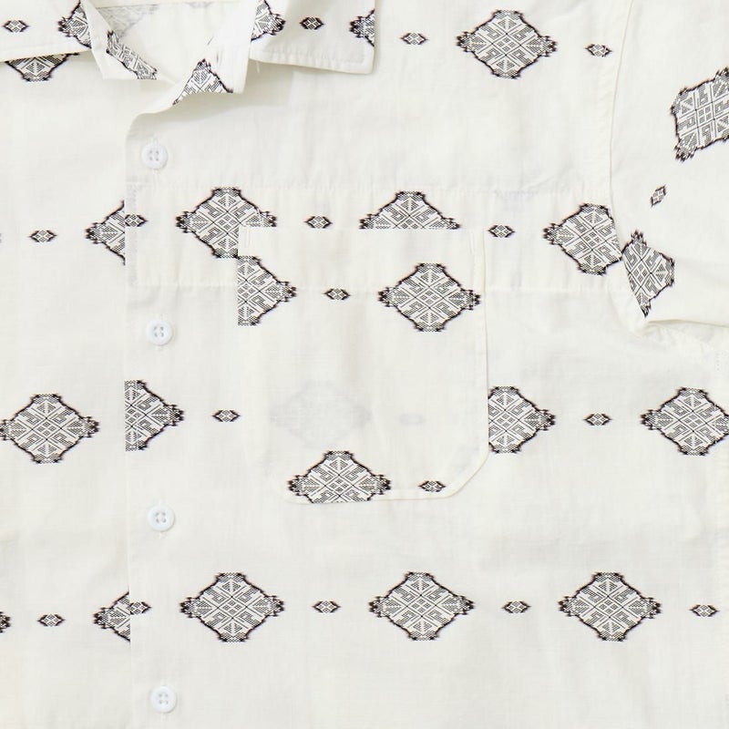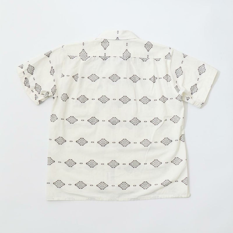 ENGINEERED GARMENTS(エンジニアド ガーメンツ)のCAMP SHIRT COTTON IKAT PRINT。オープンカラーにボックスシルエットのクラシックなデザインのキャンプシャツ。左胸と右下にポケットが配置された左右非対称なデザイン。腰周りの絞りがないボックスシルエット。素材は今シーズンのテーマであるブラックとホワイトの2色を用いたイカットパターン。夏のスタイリングに最適な1着。