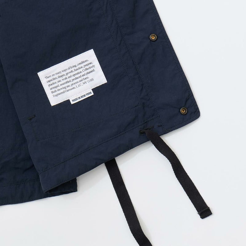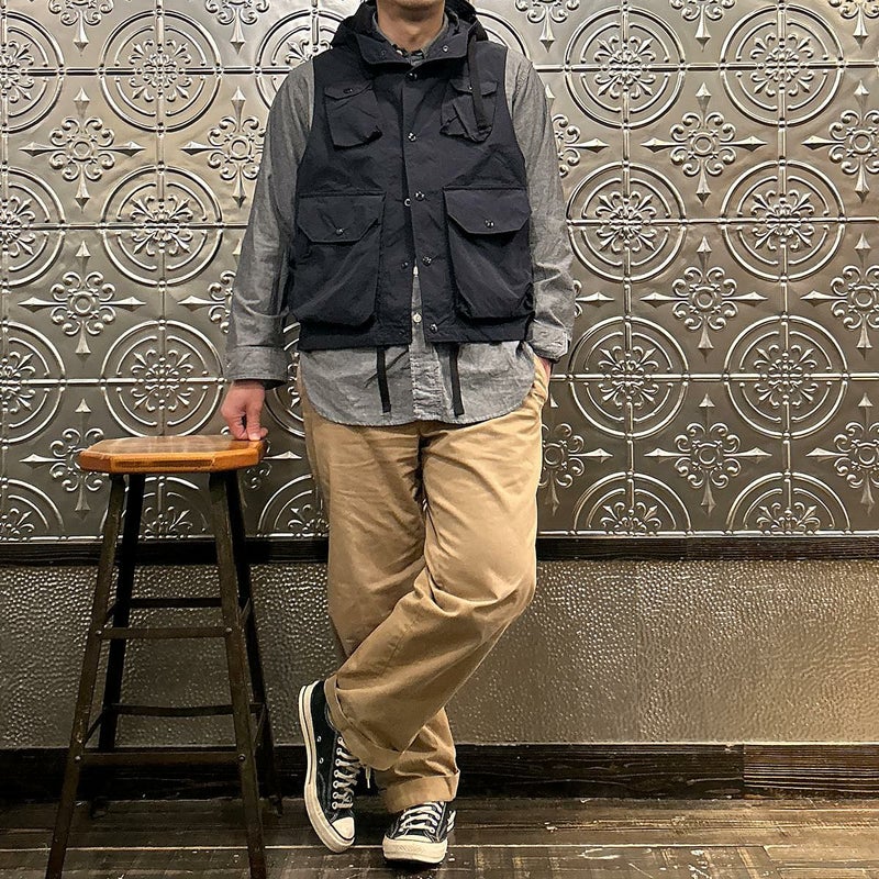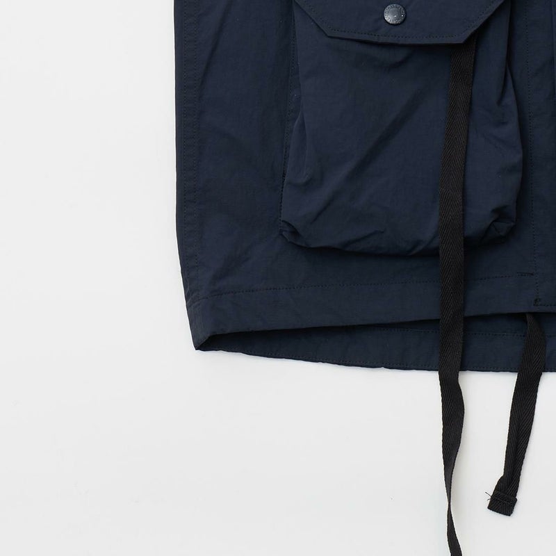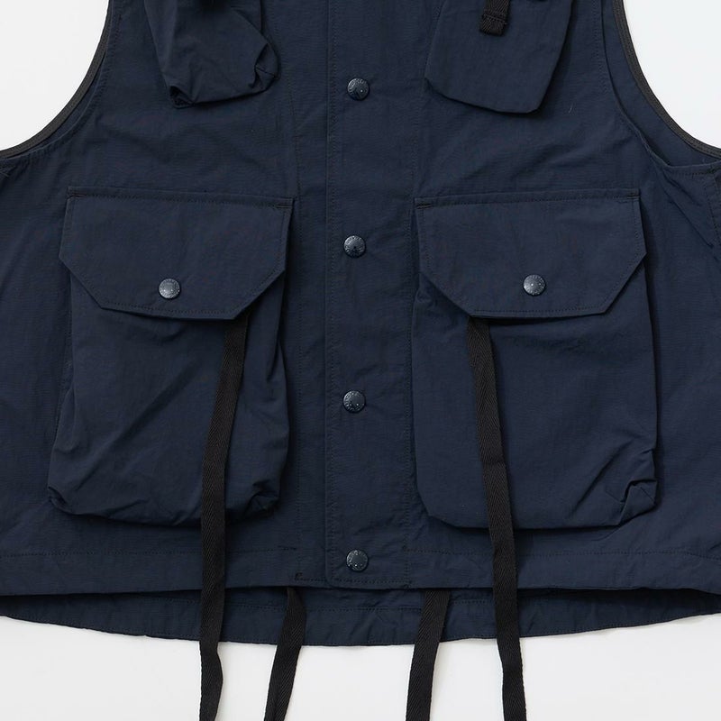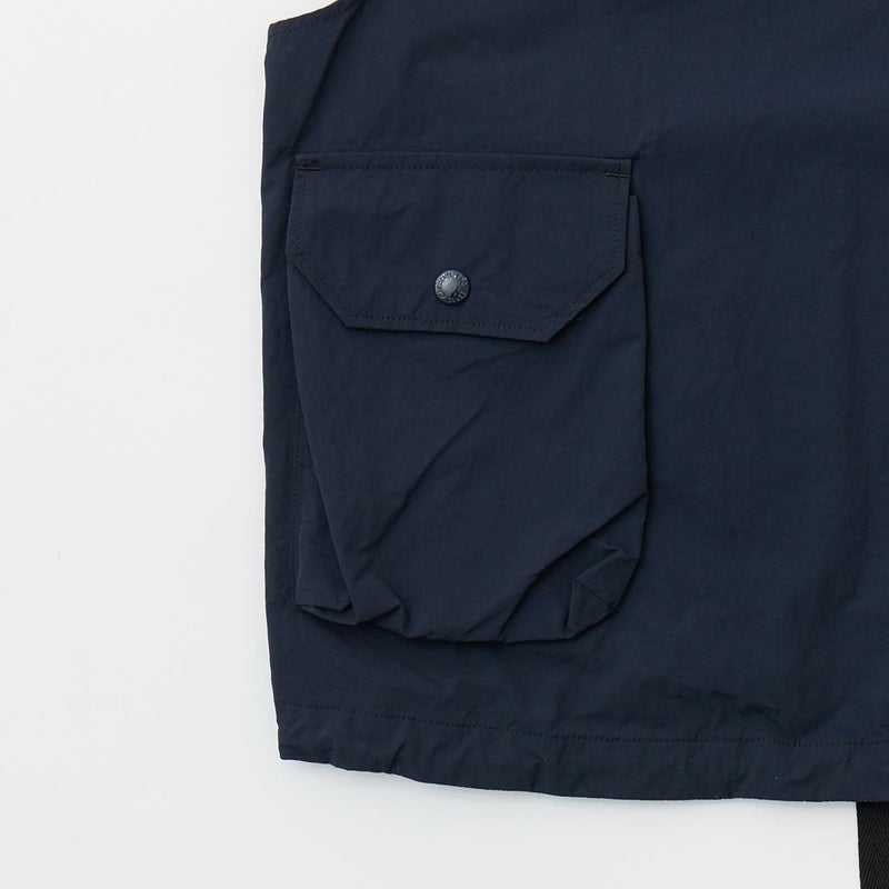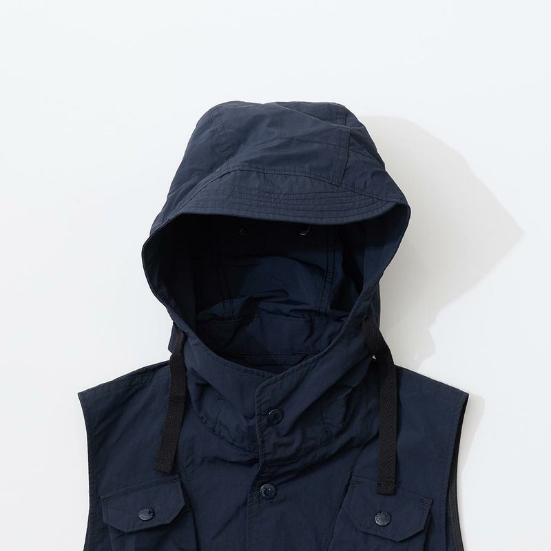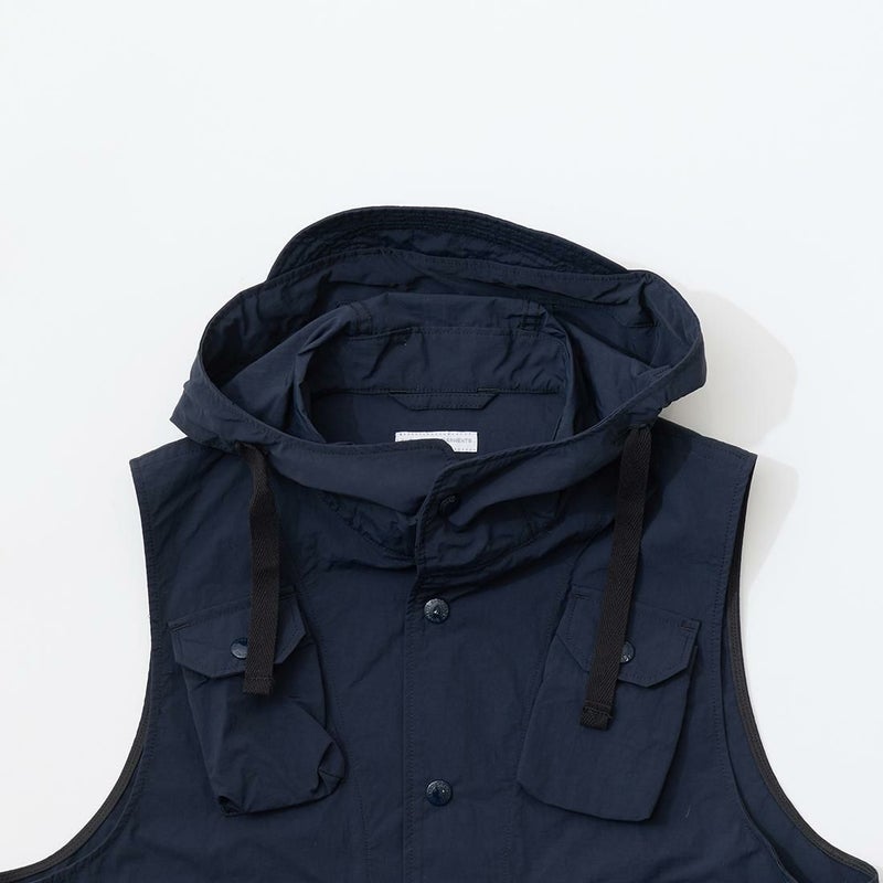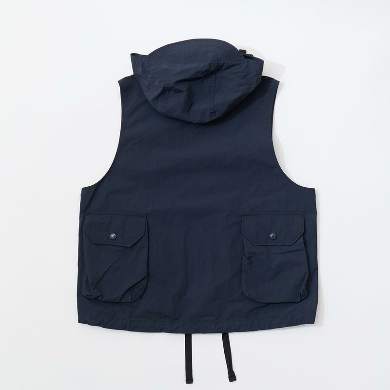 ENGINEERED GARMENTS(エンジニアドガーメンツ)のFIELD VEST POLYESTER TASLAN。マウンテンパーカの袖を無くしたようなデザインのフィールドベスト。フロントはスナップ仕様。胸、腰に左右ポケットが1つづつ。ドローコード入りのフードを装備。背面にも左右にポケットを装備。裾部分にもドローコードが装備されておりシルエットアレンジが可能。素材はタスラン加工されたポリエステル糸を採用した生地。ソフトな肌触りとシワになりにくさを兼ね備えた素材です。