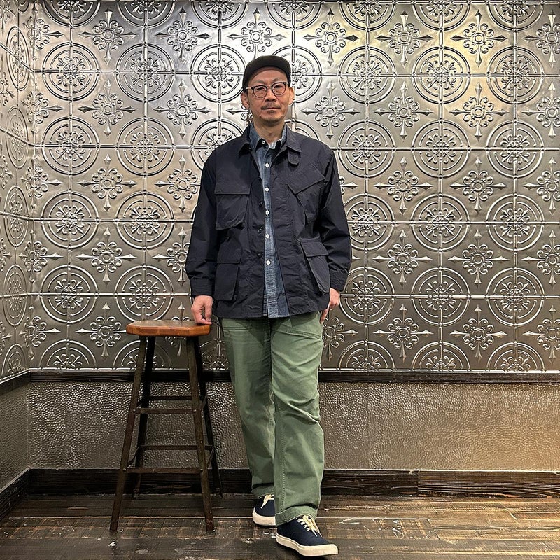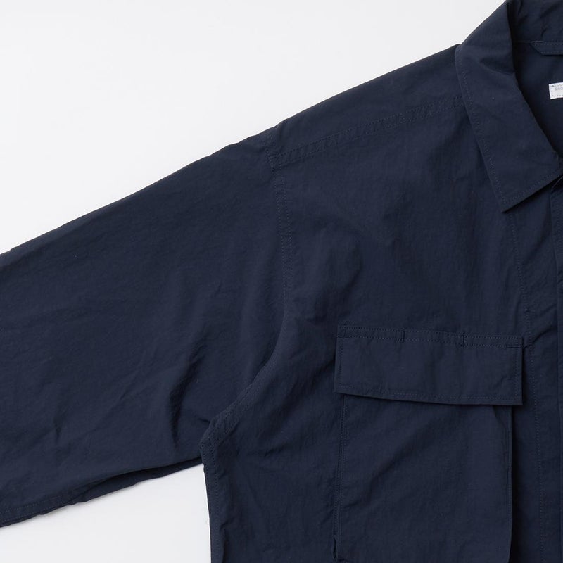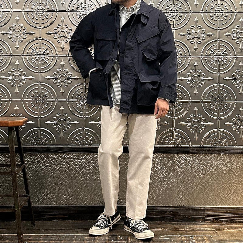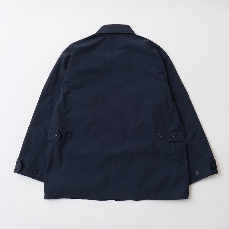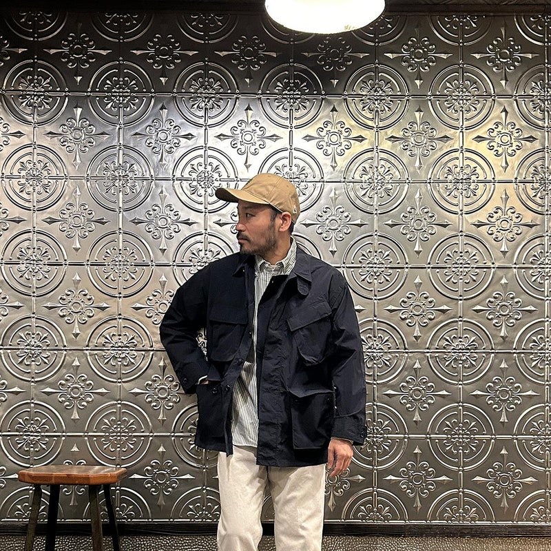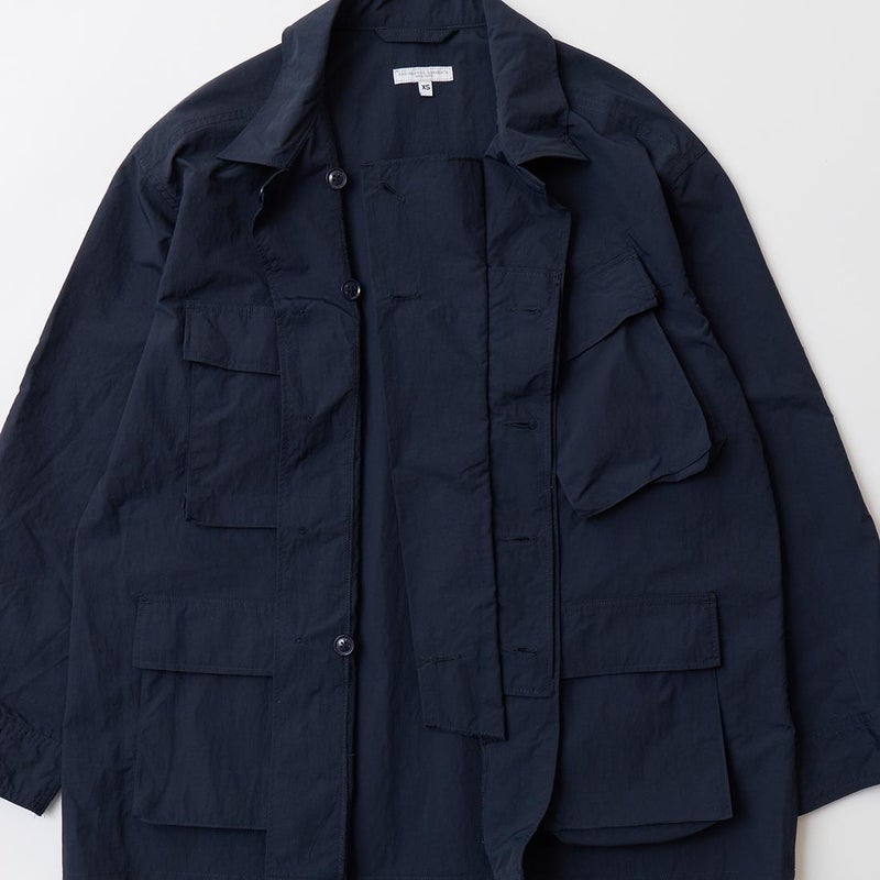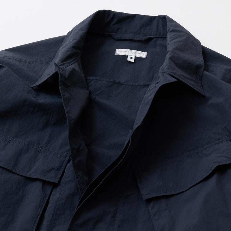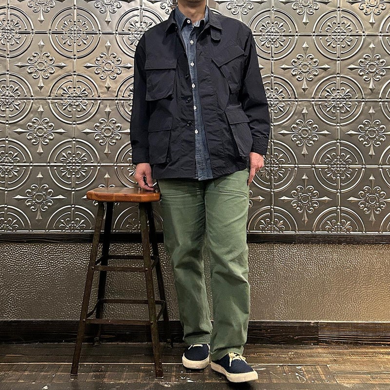 ENGINEERED GARMENTS(エンジニアド ガーメンツ)のBDU JACKET POLYESTER TASLAN。アメリカ軍のB.D.Uジャケットがデザインソース。フロントの立体感のある4つのマチ付きフラップポケット。左胸ポケットは手を入れやすいように角度をつけて配置。バックサイドにはボタン式のアジャスターを装備。シルエットアレンジが可能。袖には同素材の肘あても付いています。素材はタスラン加工されたポリエステル糸を採用した生地。ソフトな肌触りとシワになりにくさを兼ね備えた素材。