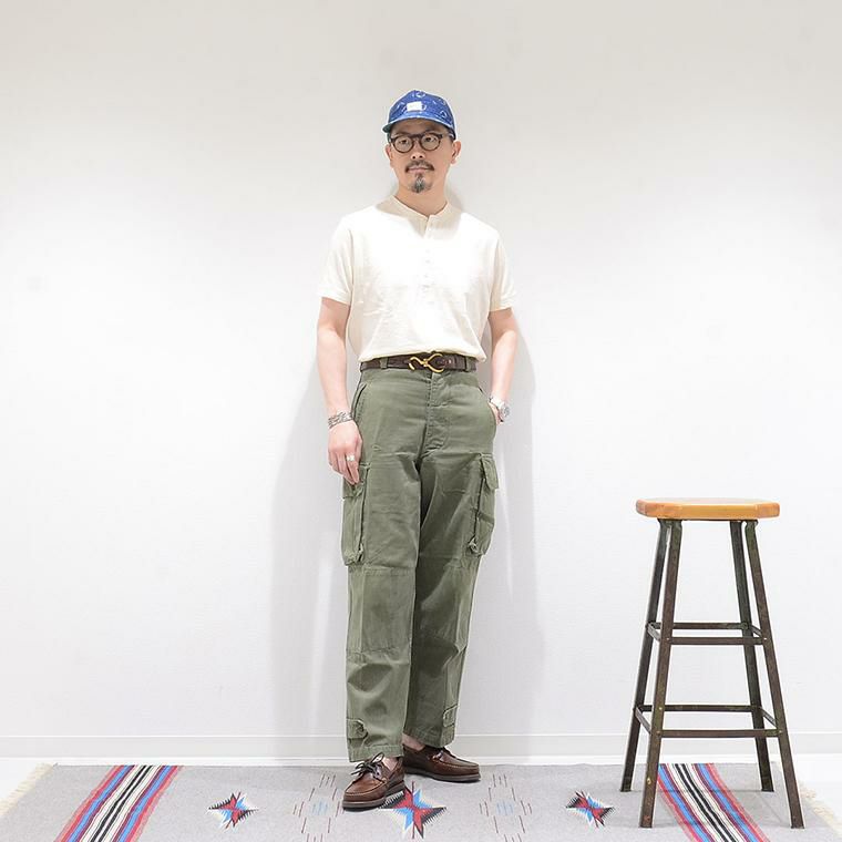EMPIRE&SONS(エンパイアアンドサンズ)のS/S COALMINER HENLEY 19 SINGLE RUFFY JERSEY。旧きよき時代のアメリカを彷彿とさせるヘンリーネックTシャツ。ボタンは猫目ボタンを使用し、フロントのヘンリー部分はジャージー素材ではなく、伸び縮みしない布帛(ふはく)に切り替えられています。フラットシーマーによる縫製で縫い合わせの部分の凹凸が少なく、着心地も抜群です。首周り、袖部分にもジグザグにステッチングを施すことでヨレを防いでいます。