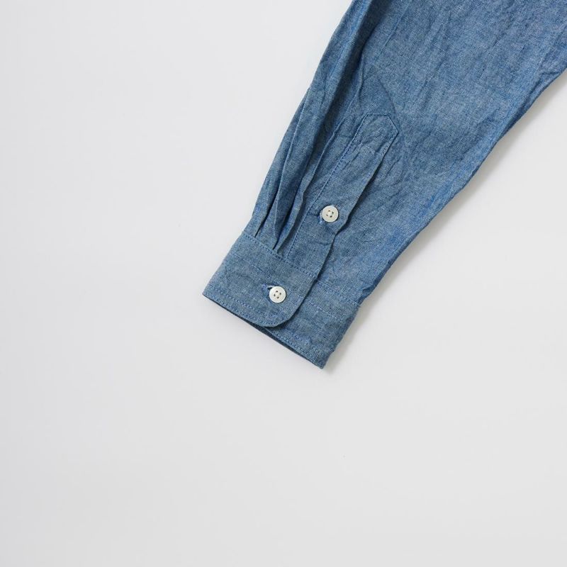 EMPIRE&SONS(エンパアアンドサンズ)のL/S CLASSIC BAND COLLAR SHIRT 5oz VINTAGE CHAMBRAY。生地に少しコシのあるシャンブレーを使用したバンドカラーシャツ。古いミリタリーのデタッチャブルカラー(取り外し可能な襟)シャツのような低めの台襟に、身頃脇には耐久性に優れたダブルステッチ(二本針)を採用。台襟の後ろに昔の名残ともいえるボタンホールがデザインとして残っています。両胸にパッチポケットを配し、ウエストに絞りの無い、ワークシャツの様なカジュアルなシルエット。着込むことで経年変化も楽しんで頂ける1着。
