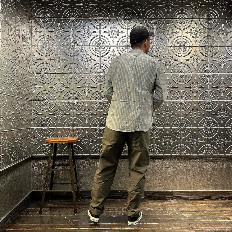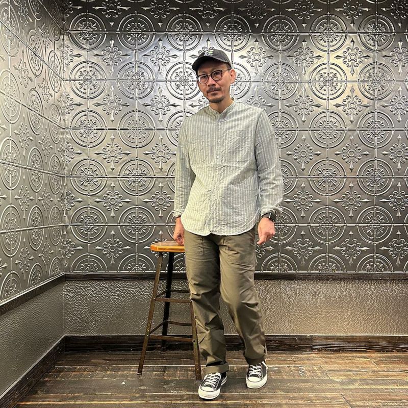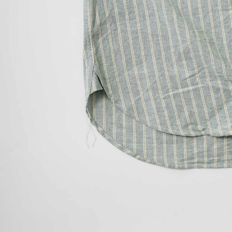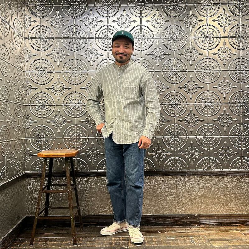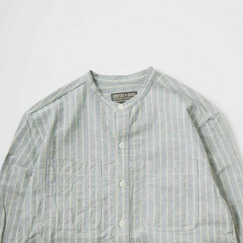 EMPIRE&SONS(エンパアアンドサンズ)のL/S CLASSIC BAND COLLAR SHIRT VINTAGE OXFORD。オックスフォードのストライプ生地を使用したバンドカラーシャツ。クラシックな色合いと風合いを持った絶妙な生地。古いミリタリーのデタッチャブルカラー(取り外し可能な襟)シャツのような低めの台襟に、身頃脇には耐久性に優れたダブルステッチ(二本針)を採用。台襟の後ろに昔の名残ともいえるボタンホールがデザインとして残っています。両胸にパッチポケットを配し、ウエストに絞りの無い、ワークシャツの様なカジュアルなシルエット。着込むことで経年変化も楽しんで頂ける1着。