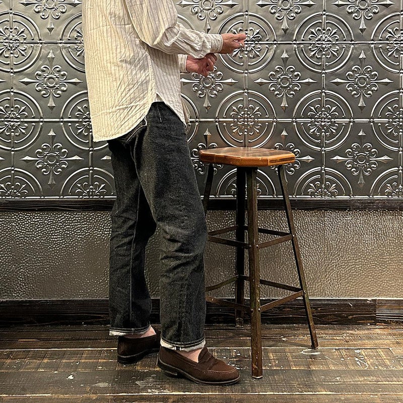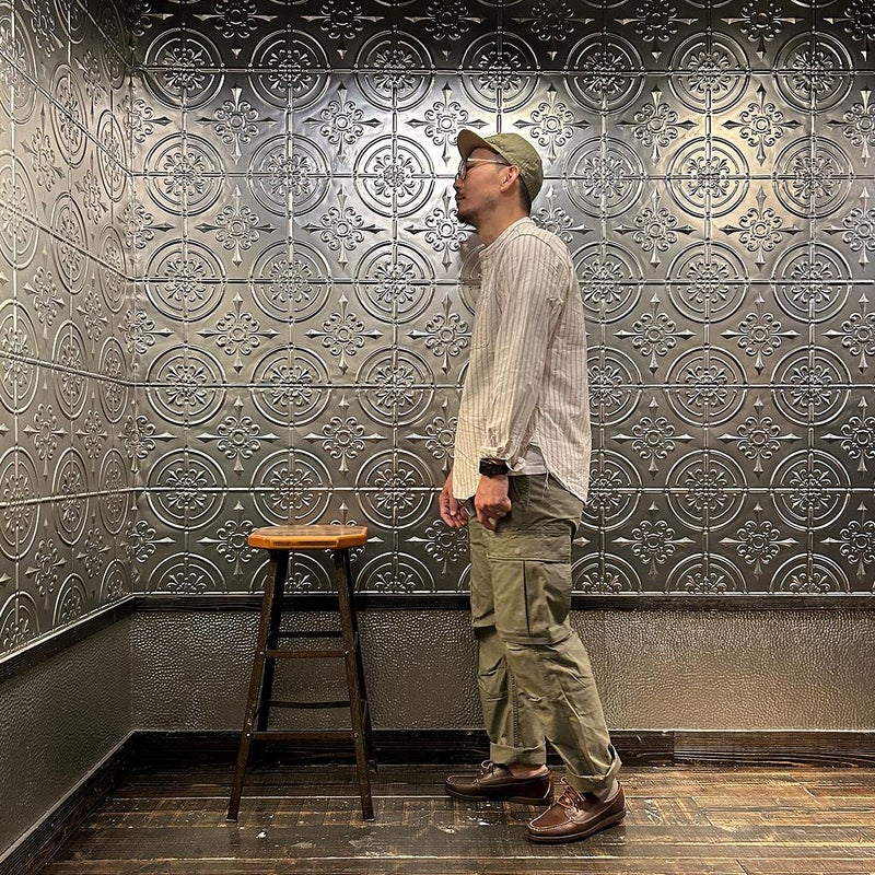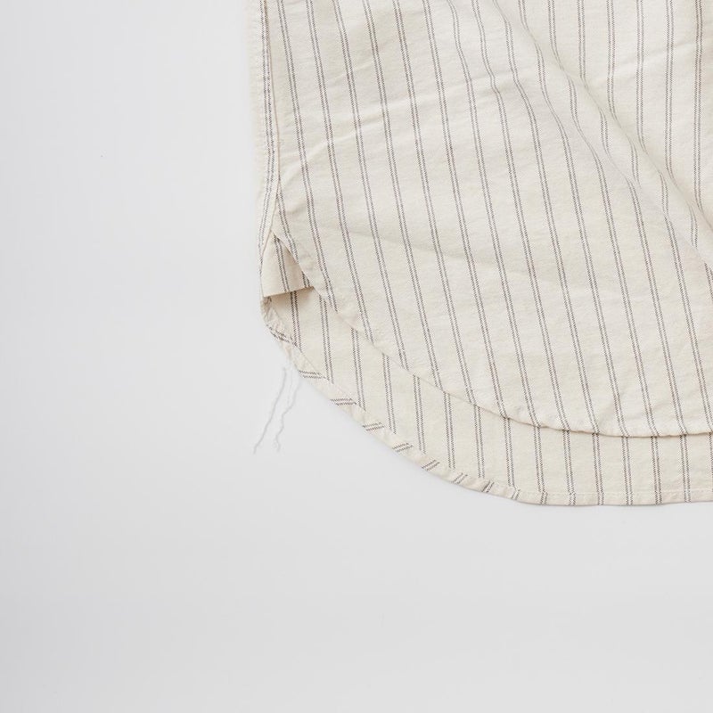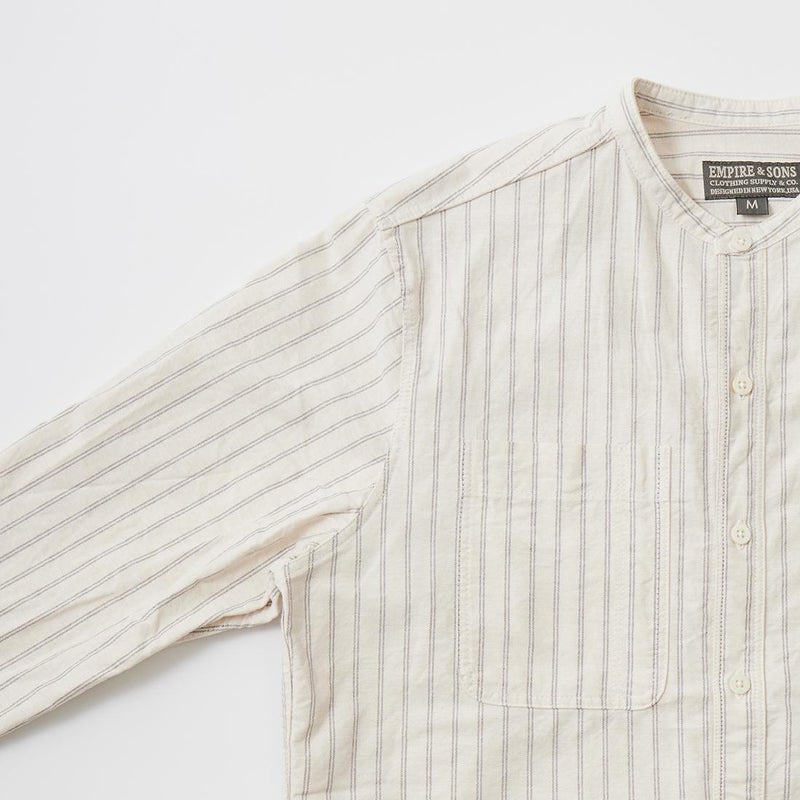 EMPIRE&SONS(エンパアアンドサンズ)のL/S CLASSIC BAND COLLAR SHIRT VINTAGE OXFORD。オックスフォードのストライプ生地を使用したバンドカラーシャツ。クラシックな色合いと風合いを持った絶妙な生地。古いミリタリーのデタッチャブルカラー(取り外し可能な襟)シャツのような低めの台襟に、身頃脇には耐久性に優れたダブルステッチ(二本針)を採用。台襟の後ろに昔の名残ともいえるボタンホールがデザインとして残っています。両胸にパッチポケットを配し、ウエストに絞りの無い、ワークシャツの様なカジュアルなシルエット。着込むことで経年変化も楽しんで頂ける1着。