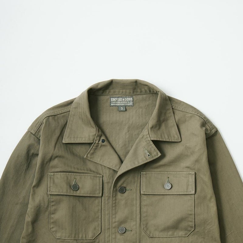 EMPIRE&SONS(エンパアアンドサンズ)のHBT SHIRT JACKET 40's 13STAR METAL BUTTON。USミリタリーの名品「M-43」「M-47」辺りのHBT(ヘリンボーンツイル)ジャケットをベースにモディファイした当店の別注モデル。「シンプルで流行り廃りなくずっと着続けられるモノ」というコンセプトで別注しました。ポケットワークや袖口の仕様などをよりシンプルにしてアウターとしてもミドルレイヤーとしても着易い仕様にアレンジしています。コットンヘリンボーンツイルのがっしりとした生地感は着込む事によって柔らかくなり経年変化も楽しめる生地。こちらは40年代のデッドストックの13スターメタルボタン(裏側のリベット部分は現行のレプリカ品)を使用。経年で塗装が剥げて素地の真鍮素材の変化と共にかなり雰囲気が出ます。