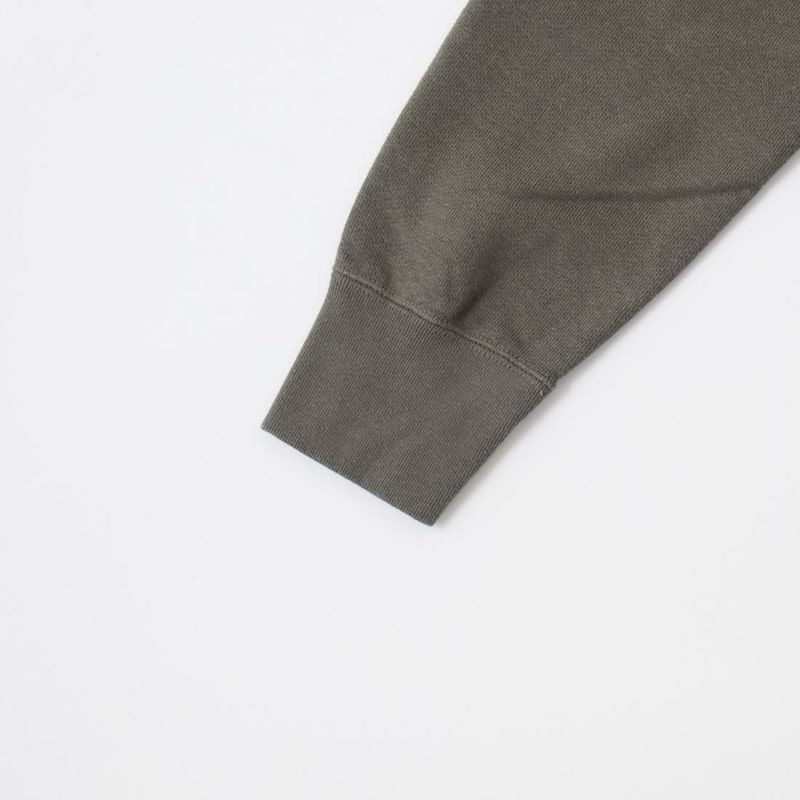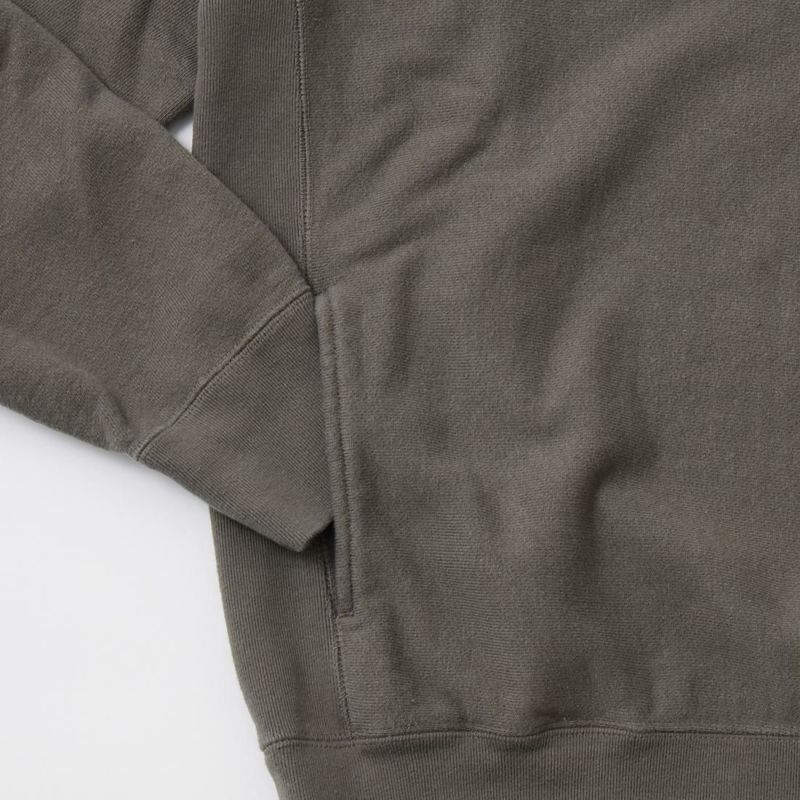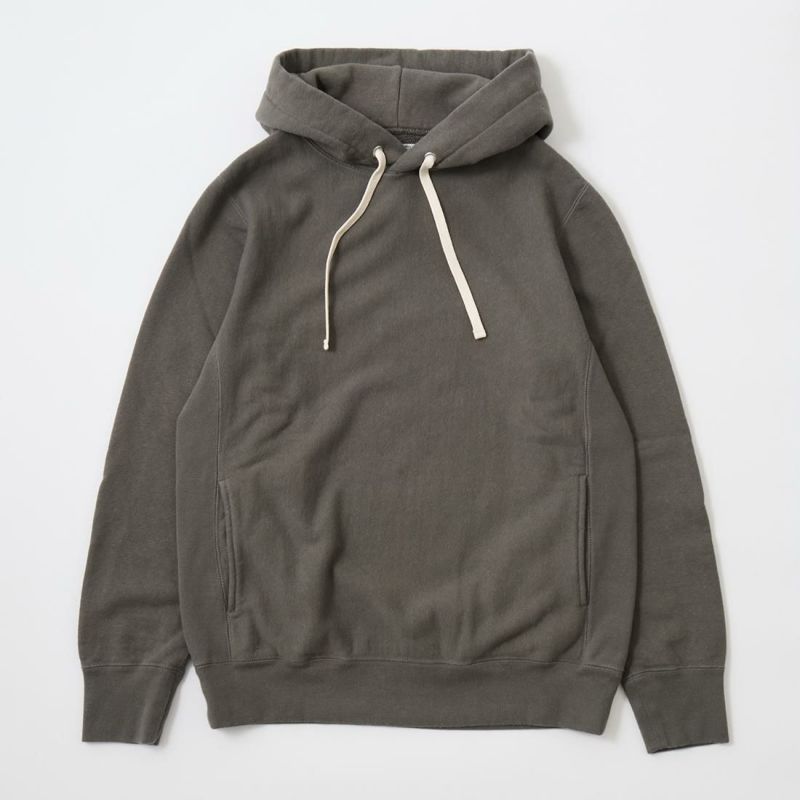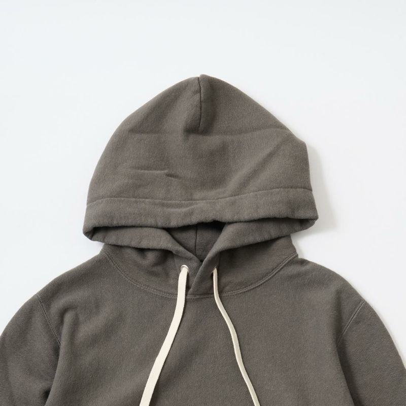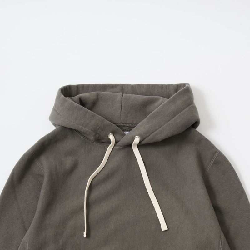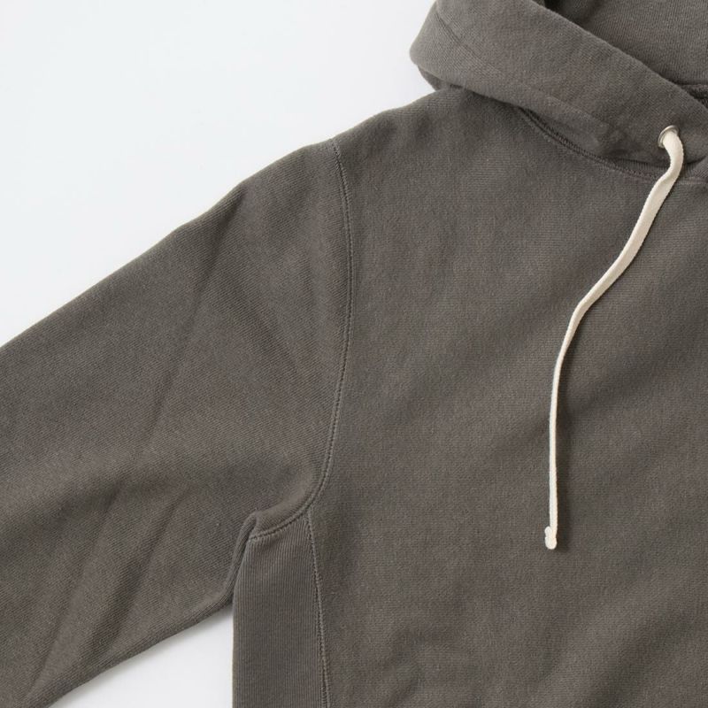 アメリカ発 16oz NEW HEAVY WEIGHT TERRY INVERSE WEAVE SWEAT HOODED PULLOVER。厚みとコシのある生地を使用したヘビーウェイトプルオーバーパーカー。ややすっきりしたシルエットに程良くゆとりを残したサイズバランスが絶妙にいい雰囲気。また生地を横向きに使用することで縦縮みを軽減し、サイドリブが横縮み防止と動きやすさを実現したインバースウィーブを仕様。ガシガシ着倒してもへこたれないタフな1枚。袖と裾のリブはやや長めに設定されたヴィンテージを彷彿させる完成度。やや下辺りにハンドウォーマーポケットが付いているのも手を入れ易い仕様。この冬新たなパーカーとして付け足して損はさせない1着です。