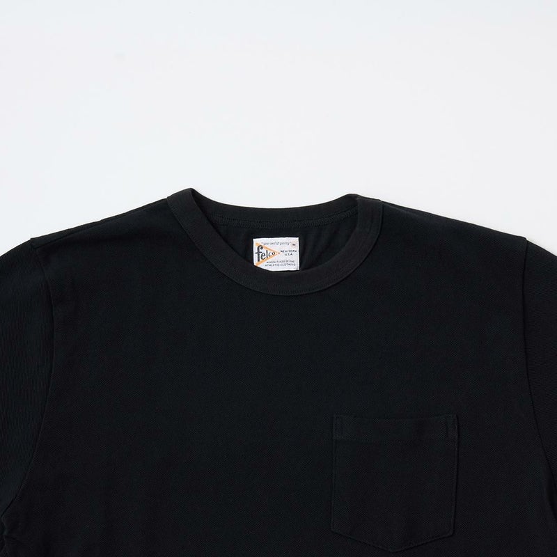 アメリカ発のアスレチックウェアブランドFELCO(フェルコ)のS/S PIQUE CREW POCKET TEE 40/2 INDIAN COTTON TUCK STITCH。インディアンコットンのピケ素材の生地を使用した、セットインのクルーネックTシャツ。インド綿の生地は柔らかく、サラッとして清涼感のある素材感、肌触りの良さが特徴。ネック部分と袖口はリブの仕様で、左胸にパッチポケット付き。アメリカブランドらしい、ややゆとりのあるボックスのシルエットと、吸汗性抜群かつ速乾性もあるピケ素材で快適な着心地です。裾、両サイドにスリット入り、左袖口にはブランドロゴのワッペンがワンポイントでつけられています。