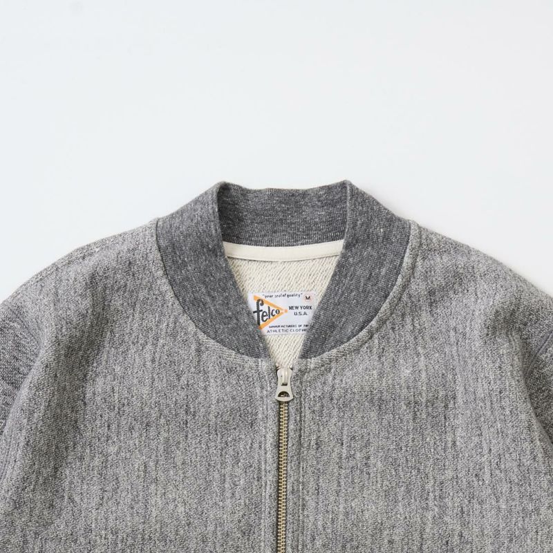 FELCO(フェルコ)の16oz TERRY ZIP BASEBALL NECK W/SLASH POCKET。程よい厚みとコシのある16オンスのヘビーウェイトのフレンチテリー(裏起毛していないスウェット生地)素材を使用したジップフロントのベースボールカラーのジャケット。程良いゆとりのあるシルエットがアメリカらしく良い雰囲気。生地を横向きに使用することで縦縮みを軽減し、サイドリブが横縮み防止と動きやすさを実現したインバースウィーブ仕様。ガシガシ着倒してもへこたれないタフな1枚。袖と裾のリブはやや長めに設定されたヴィンテージを彷彿させる完成度の高いスウェット。腰部分の左右にスラッシュポケットが装備されており機能性も高い1着。アウターとしての使用は勿論ですが、ダウンベストなどのインナーアイテムとしても使って頂ける汎用性も高い1着です。