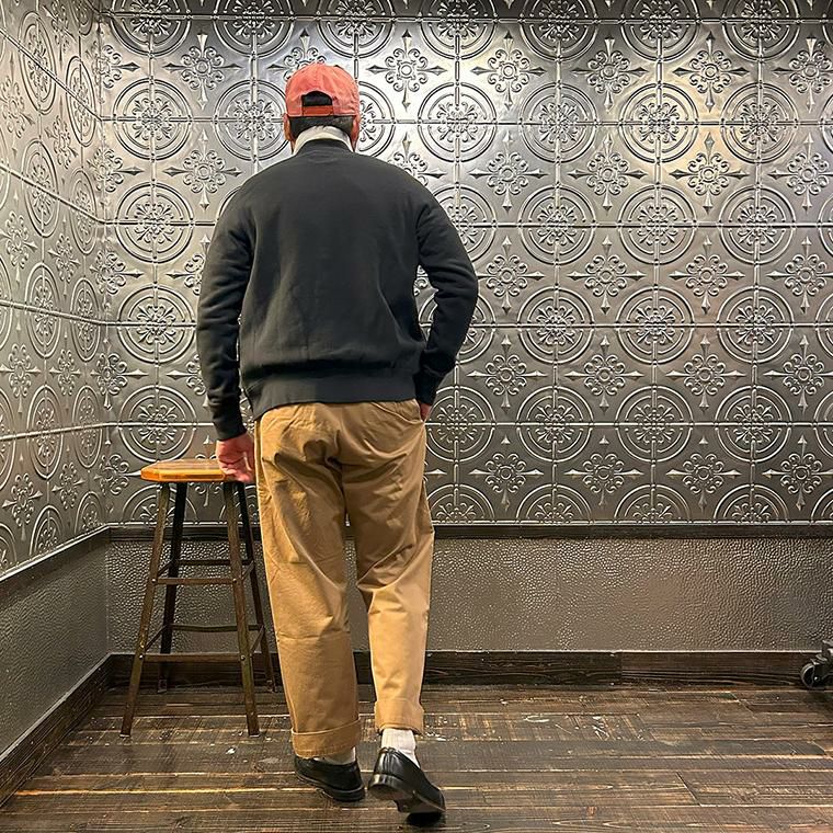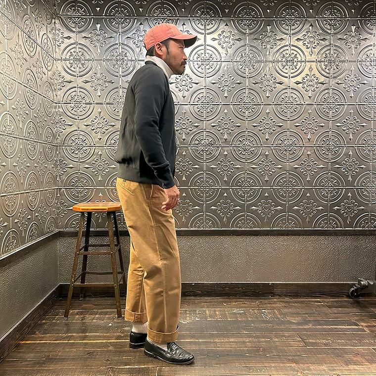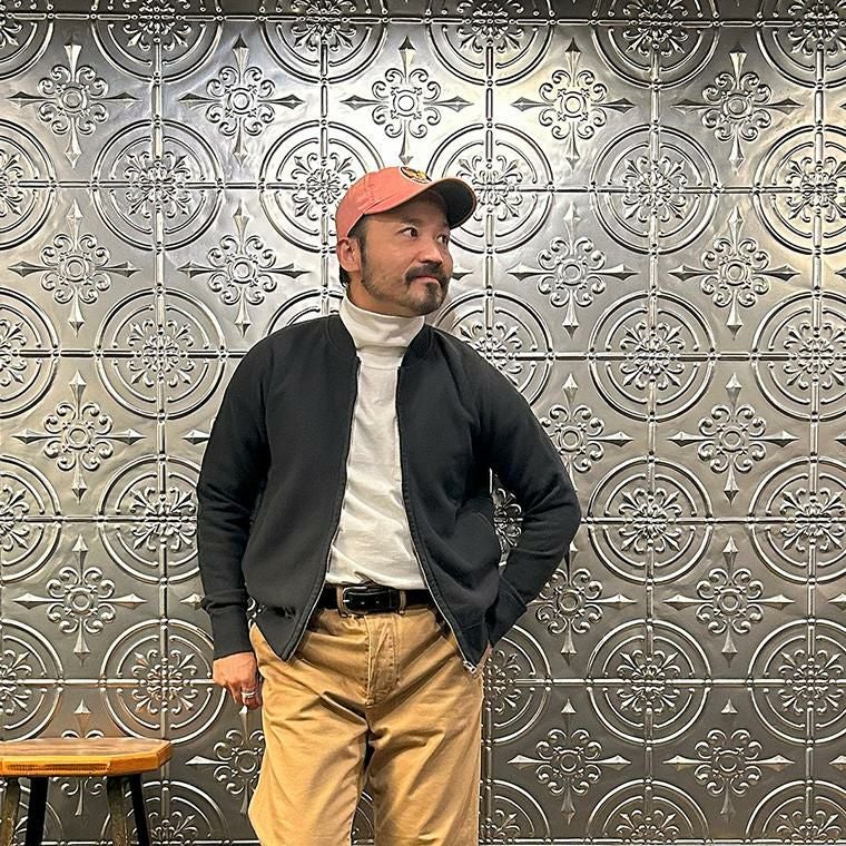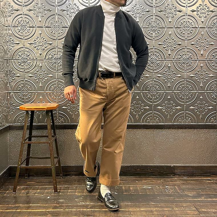 170センチ68キロやや肩幅広めの私の体型でサイズ選びはMサイズで個人的には丁度良いサイズだと思いました。身幅はややゆとりのあるシルエットで、アームホールはスッキリとしたバランス。肩幅は広めで、袖丈はやや長めのつくりです。このサイズであればインナーにシャツやカットソーぐらいの軽めのアイテムを着て羽織ってもストレスなく着れます。ただもう少しゆとりがある着方がお好みでしたらLサイズがオススメ。とくに身幅、アームホール、着丈は雰囲気が変わりますね。アメリカらしいヴィンテージ感漂うベースボールカラーのジャケット。ガチっとしたコシのある柔らかい生地感を採用した耐久性に優れた着心地の良い1着。春秋シーズンはアウター使いとして、寒い冬シーズンはインナー使いとして。使い勝手の良さを考えるとかなり重宝できるアイテムです。
