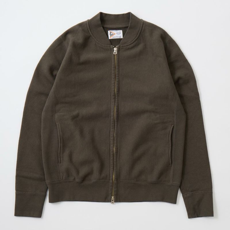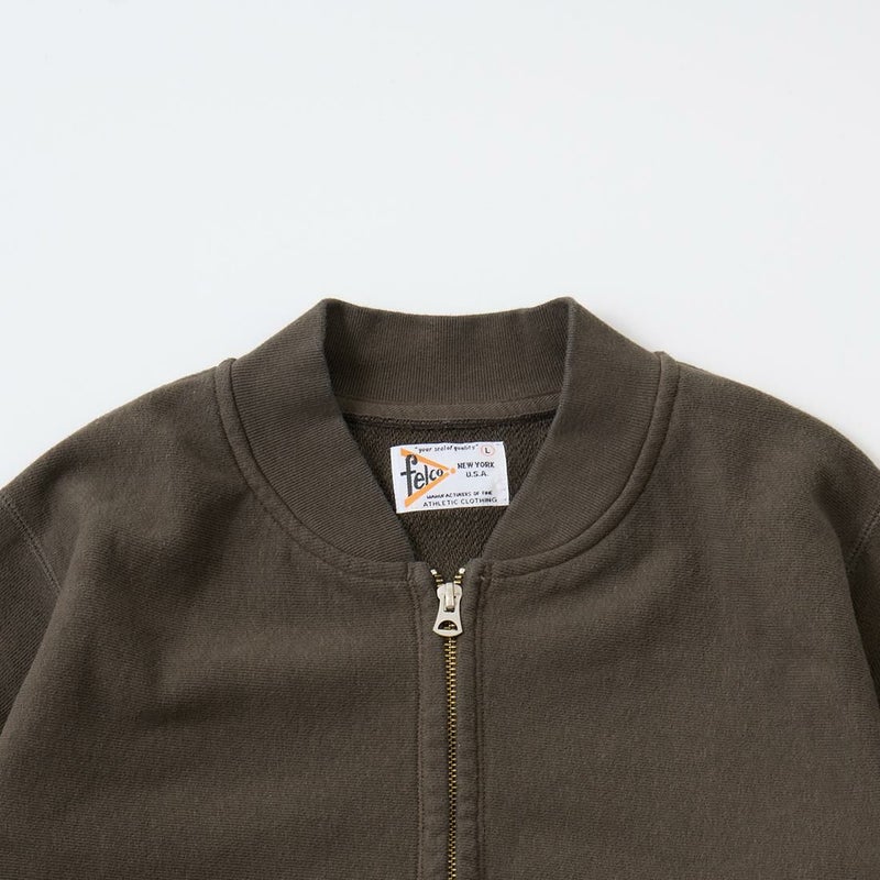 FELCO(フェルコ)の16oz TERRY ZIP BASEBALL NECK W/SLASH POCKET。程よい厚みとコシのある16オンスのヘビーウェイトのフレンチテリー(裏起毛していないスウェット生地)素材を使用したジップフロントのベースボールカラーのジャケット。程良いゆとりのあるシルエットがアメリカらしく良い雰囲気。生地を横向きに使用することで縦縮みを軽減し、サイドリブが横縮み防止と動きやすさを実現したインバースウィーブ仕様。ガシガシ着倒してもへこたれないタフな1枚。袖と裾のリブはやや長めに設定されたヴィンテージを彷彿させる完成度の高いスウェット。腰部分の左右にスラッシュポケットが装備されており機能性も高い1着。アウターとしての使用は勿論ですが、ダウンベストなどのインナーアイテムとしても使って頂ける汎用性も高い1着です。