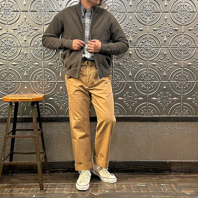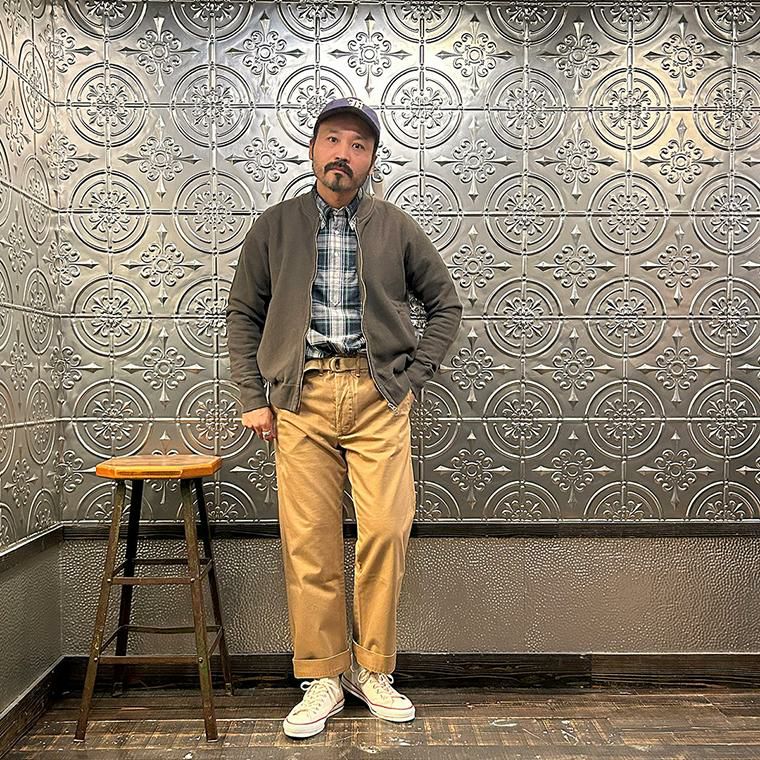 170センチ68キロやや肩幅広めの私の体型でサイズ選びはMサイズで個人的には丁度良いサイズだと思いました。身幅はややゆとりのあるシルエットで、アームホールはスッキリとしたバランス。肩幅は広めで、袖丈はやや長めのつくりです。このサイズであればインナーにシャツやカットソーぐらいの軽めのアイテムを着て羽織ってもストレスなく着れます。ただもう少しゆとりがある着方がお好みでしたらLサイズがオススメ。とくに身幅、アームホール、着丈は雰囲気が変わりますね。アメリカらしいヴィンテージ感漂うベースボールカラーのジャケット。ガチっとしたコシのある柔らかい生地感を採用した耐久性に優れた着心地の良い1着。春秋シーズンはアウター使いとして、寒い冬シーズンはインナー使いとして。使い勝手の良さを考えるとかなり重宝できるアイテムです。