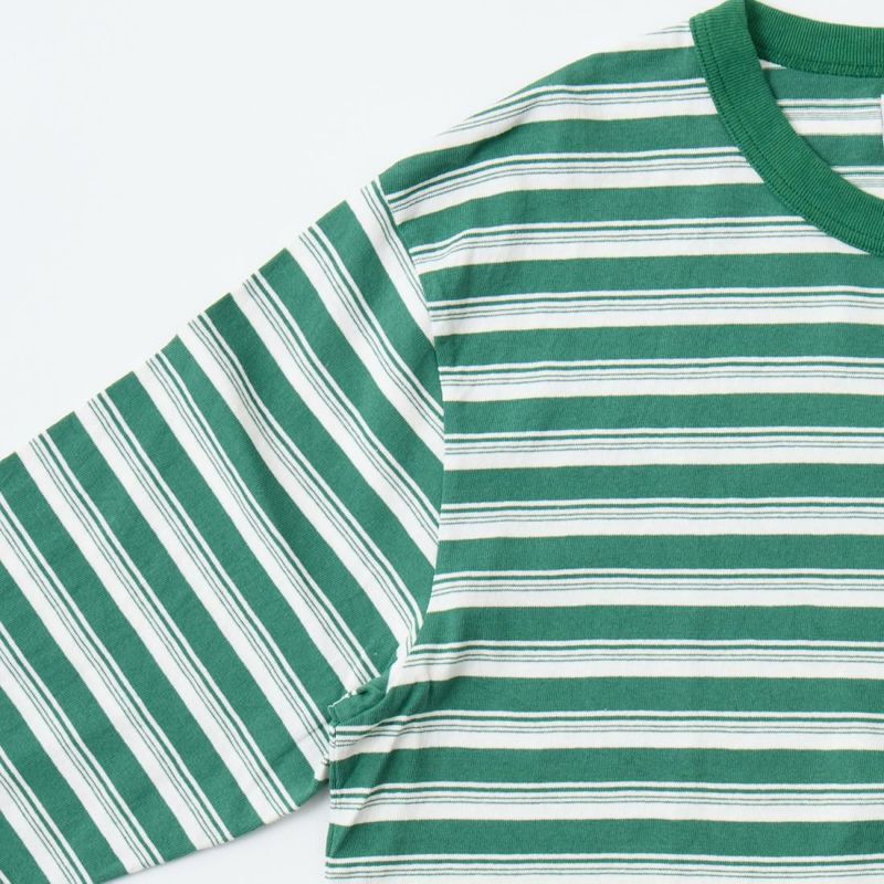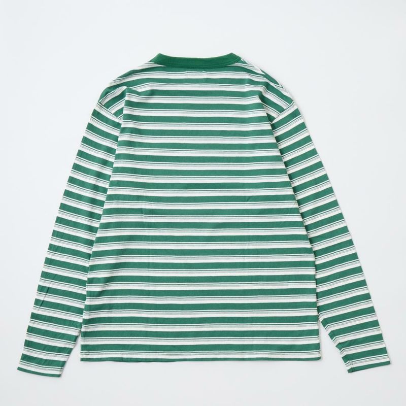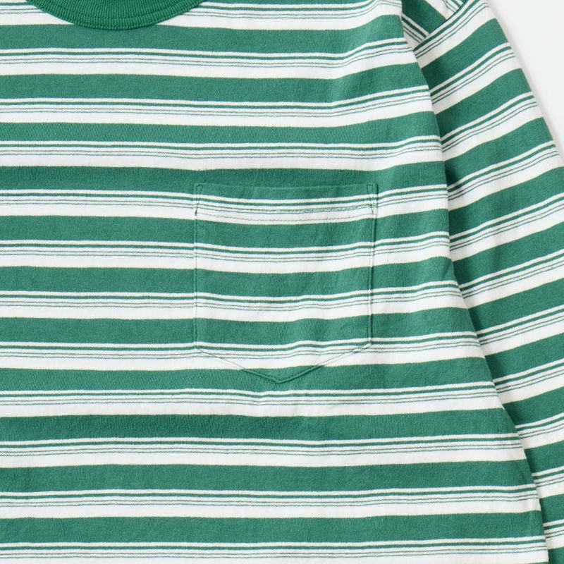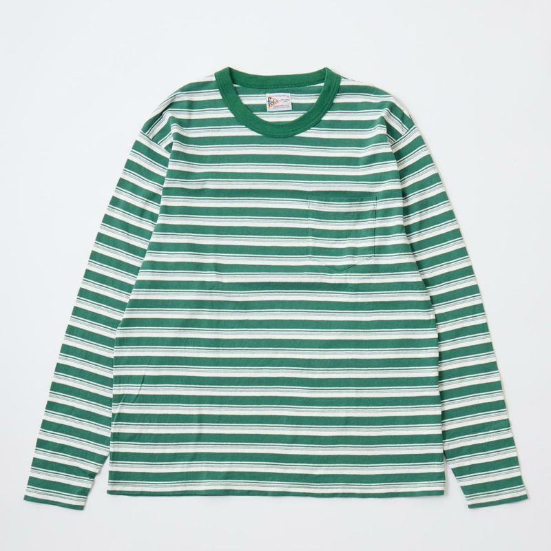 FELCO(フェルコ)のL/S BINDER NECK CREW STRIPE POCKET T AMERICAN DRY JERSEY STRIPE2。ストライプ柄のコットン素材を使用したクルーネックの長袖Tシャツ。しっかりとしたバインダーネックの襟元や胸のポケット、リブなしの袖口が特徴的なディテール。アメリカブランドらしいボックスシルエットで程良いゆとりがあり、インナーアイテムとしては勿論ですが一枚での着用でもサマになるロンTです。薄すぎず、厚過ぎないアウター、インナーと活躍してくれる丁度良いウエイトのコットン素材。スタライブ柄がスタイリングのアクセントになってくれる1着です。