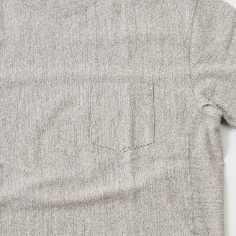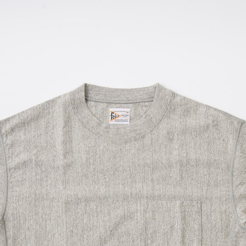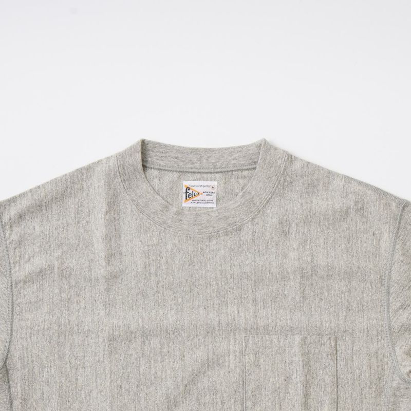 FELCO(フェルコ)のS/S INVERSE WEAVE TEE 7oz 18SINGLE JERSEY。シンプルなデザインで幅広い着こなしに対応してくれるクルーネックの半袖Tシャツ。胸にポケットを配置し、生地を横向きに使用することで縦縮みを軽減し、サイドリブが横縮み防止と動きやすさを実現したインバースウィーブ仕様。アメリカブランドらしいボックスシルエットで程良いゆとりがあり、インナーには勿論一枚でもサマになるロンTです。インバースウィーブと7オンスのタフな生地で、着倒しても型崩れしにくくへこたれない、デイリーに着用して頂ける1枚です。