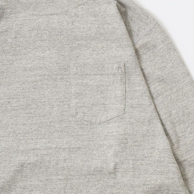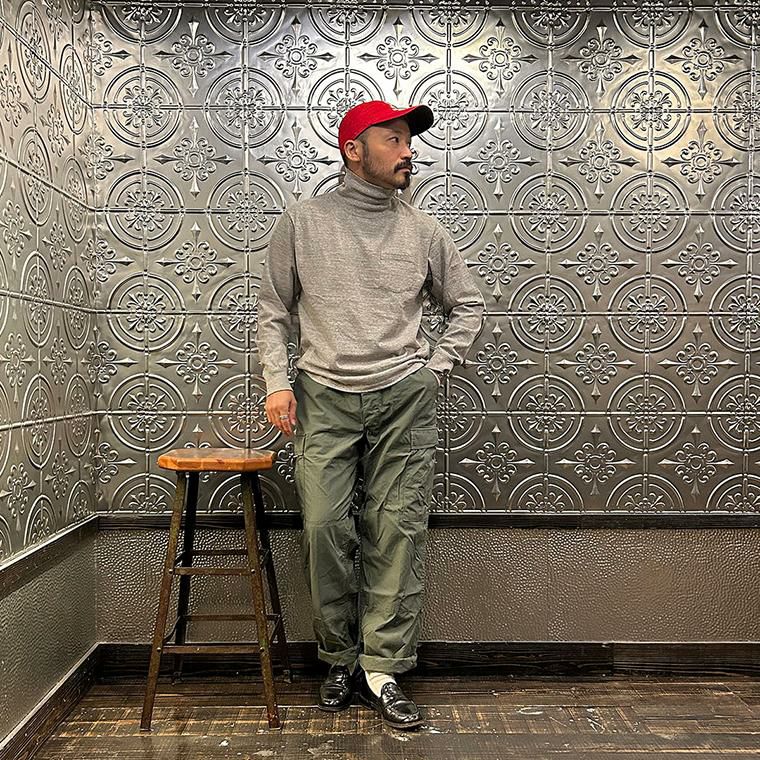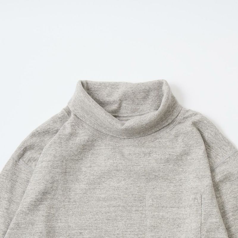 FELCO(フェルコ)のL/S TURTLE NECK POCKET T 7oz 18 SINGLE JERSEY。タートルネックの高さや幅が良い塩梅の雰囲気のある長袖Tシャツ。襟元や胸のポケット、リブ付きの袖口が特徴的なディテール。アメリカブランドらしいボックスシルエットで程良いゆとりがあり、一枚での着用は勿論ですがインナーとしても活躍。7オンスのタフな生地で着倒しても型崩れしにくいデイリーに着用して頂ける1着。