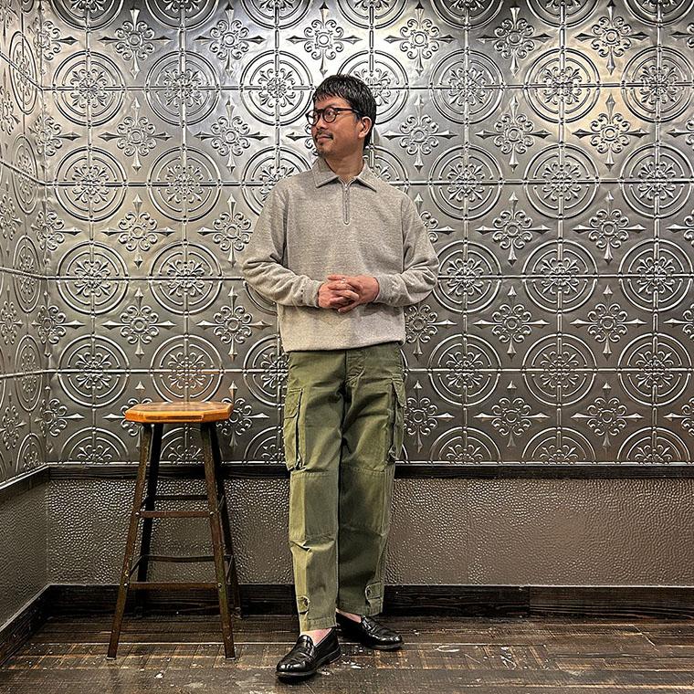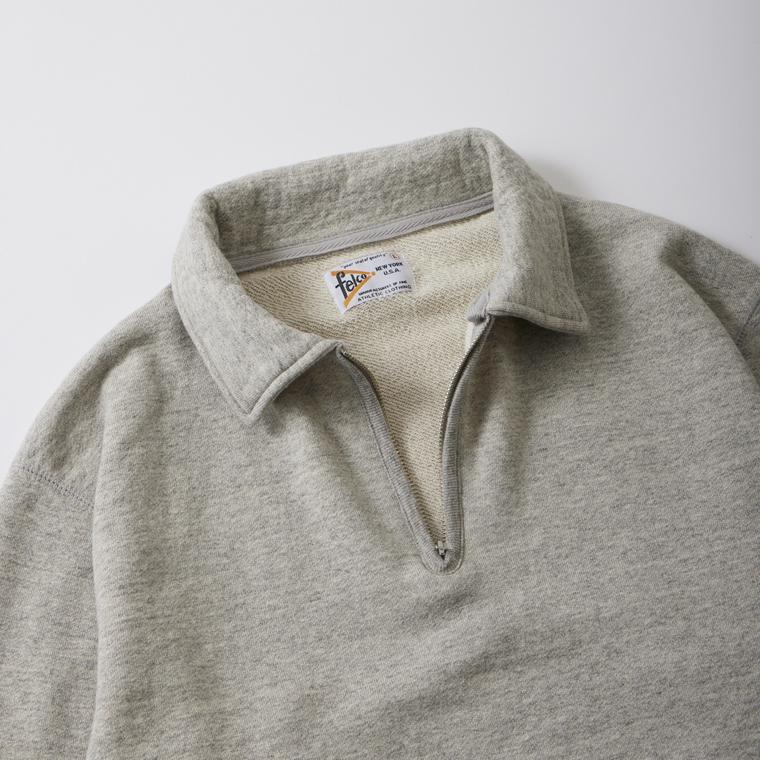 FELCO(フェルコ)の10oz LT WEIGHT FRENCH TERRY L/S HALF ZIP COLLARED SWEAT。10オンスのフレンチテリー(裏起毛していないスウェット生地)素材を使用したセットインスリーブのハーフジップのスウェットシャツ。40-50年代に多く見られるハーフジップの襟付きタイプのスウェットを現代風にモディファイ。袖口、裾はヴィンテージライクな長めのリブ仕様。肩や脇部分はフラットシーム仕上げ。特に襟周りのフィッティング、襟の立ち上がりや上着を着た時の襟の収まりに拘った一枚