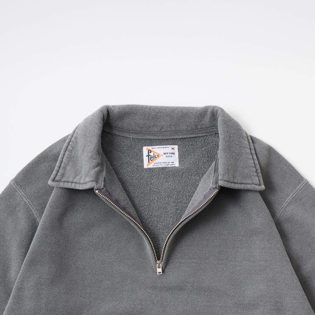 FELCO(フェルコ)の10oz LT WEIGHT FRENCH TERRY L/S HALF ZIP COLLARED SWEAT。10オンスのフレンチテリー(裏起毛していないスウェット生地)素材を使用したセットインスリーブのハーフジップのスウェットシャツ。40-50年代に多く見られるハーフジップの襟付きタイプのスウェットを現代風にモディファイ。袖口、裾はヴィンテージライクな長めのリブ仕様。肩や脇部分はフラットシーム仕上げ。特に襟周りのフィッティング、襟の立ち上がりや上着を着た時の襟の収まりに拘った一枚