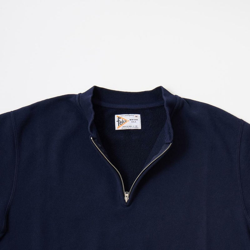 FELCO(フェルコ)のS/S ZIP BASEBALL COLLAR SWEAT 10oz LT WEIGHT FRENCH TERRY。10オンスのフレンチテリー(裏起毛していないスウェット生地)素材を使用したハーフジップベースボールカラースウェットシャツ。雰囲気のある襟元のハーフジップのベースボールカラー。裾はヴィンテージライクな長めのリブ仕様。肩や脇部分はフラットシーム仕上げ。Tシャツよりも耐久性が高く型崩れしにくいのでデイリーに着用可能。