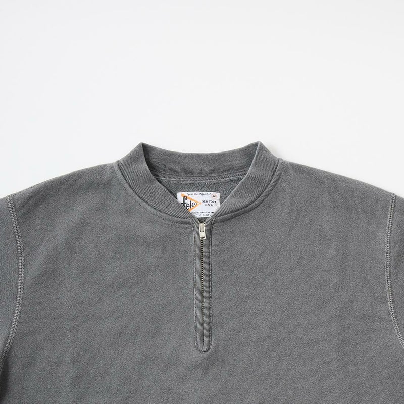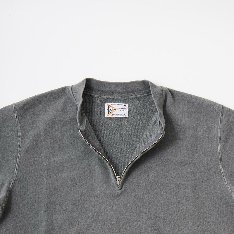 FELCO(フェルコ)のS/S ZIP BASEBALL COLLAR SWEAT 10oz LT WEIGHT FRENCH TERRY。10オンスのフレンチテリー(裏起毛していないスウェット生地)素材を使用したハーフジップベースボールカラースウェットシャツ。雰囲気のある襟元のハーフジップのベースボールカラー。裾はヴィンテージライクな長めのリブ仕様。肩や脇部分はフラットシーム仕上げ。Tシャツよりも耐久性が高く型崩れしにくいのでデイリーに着用可能。
