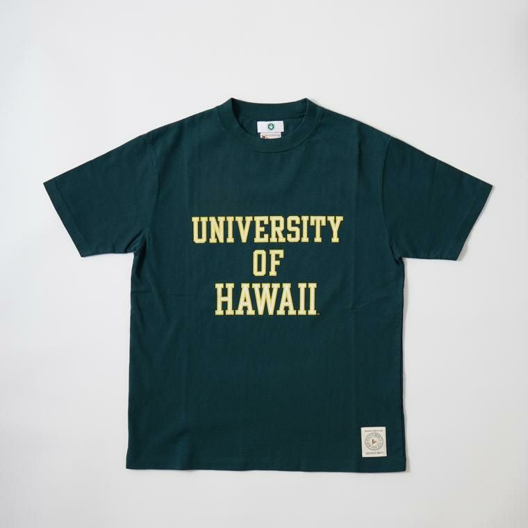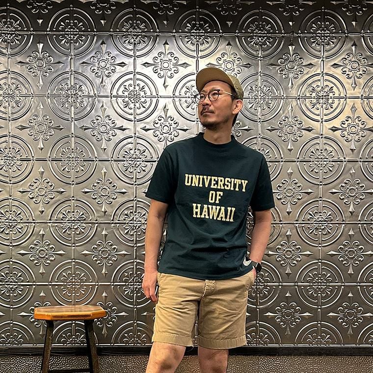 FELCO(フェルコ)のS/S HI CREW TEE UNIVERSITY OF HAWAII。U.S カレッジ公認のオリジナルコレクションアイテムとなるショートスリーブのプリントTシャツ。太めのネックリブで首元の詰まった、ハイクルーと言われるネック部分が特徴的なデザイン。ミドルウエイトのサラッとした着用感の良いコットン素材。左袖口のワッペンと左裾に付けられたオリジナルタグがちょっとしたアクセント。こちらはアメリカンフットボール、野球やバスケットボールなど米大学スポーツでも有名な University of Hawaii(ハワイ大学)のロゴがプリントされたモデル。