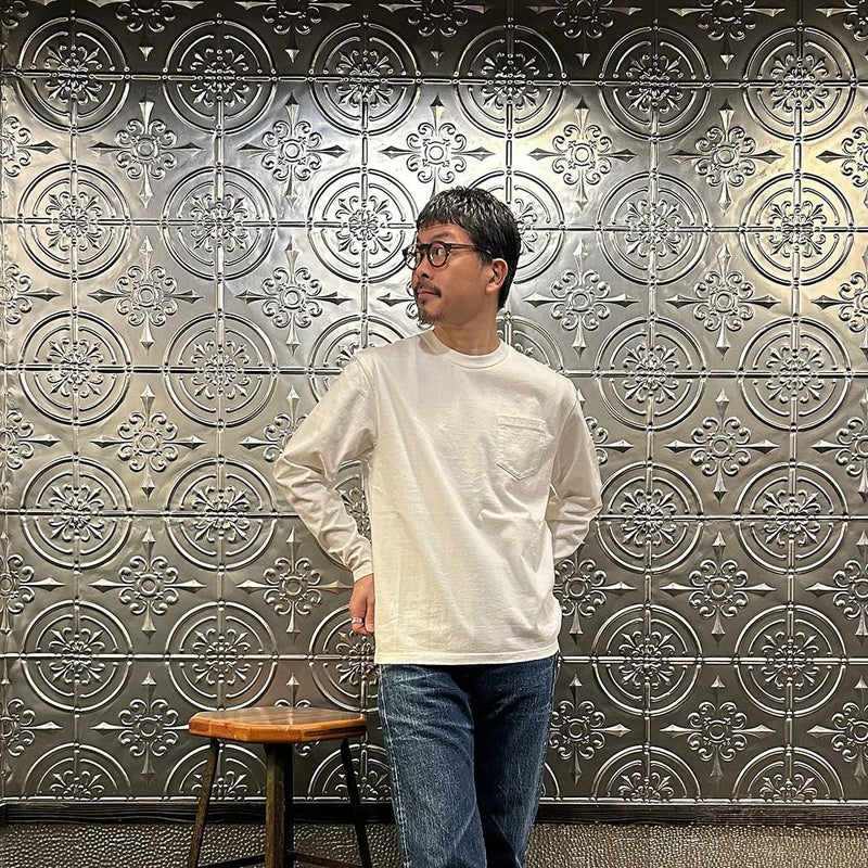 FELCO(フェルコ)のL/S BINDER NECK CREW POCKET T 7oz 16SINGLE RUFFY JERSEY。シンプルなデザインで幅広い着こなしに対応してくれるクルーネックの長袖Tシャツ。しっかりとしたバインダーネックの襟元や胸のポケット、リブなしの袖口、左袖口のワッペンが特徴的なディテール。ボックスシルエットで身幅に程良いゆとりがあり、インナーとしては勿論、一枚での着用でも様になるロンT。7オンスのタフな生地で、着倒しても型崩れしにくくデイリーに着用して頂ける1着。