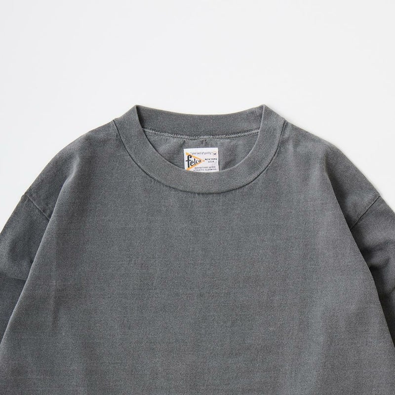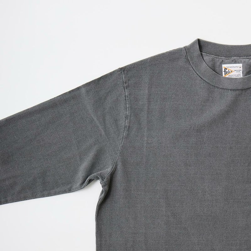 FELCO(フェルコ)のL/S HI CREW T 7oz 16SINGLE RUFFY JERSEY。太めのネックリブで首元の詰まった、ハイクルーと言われるネック部分が特徴的なデザインの長袖Tシャツ。ボックスシルエットで身幅に程良いゆとり。一枚での着用は勿論、インナーとしても活躍。7オンスのタフな生地で着倒しても型崩れしにくいデイリーに使える1着。