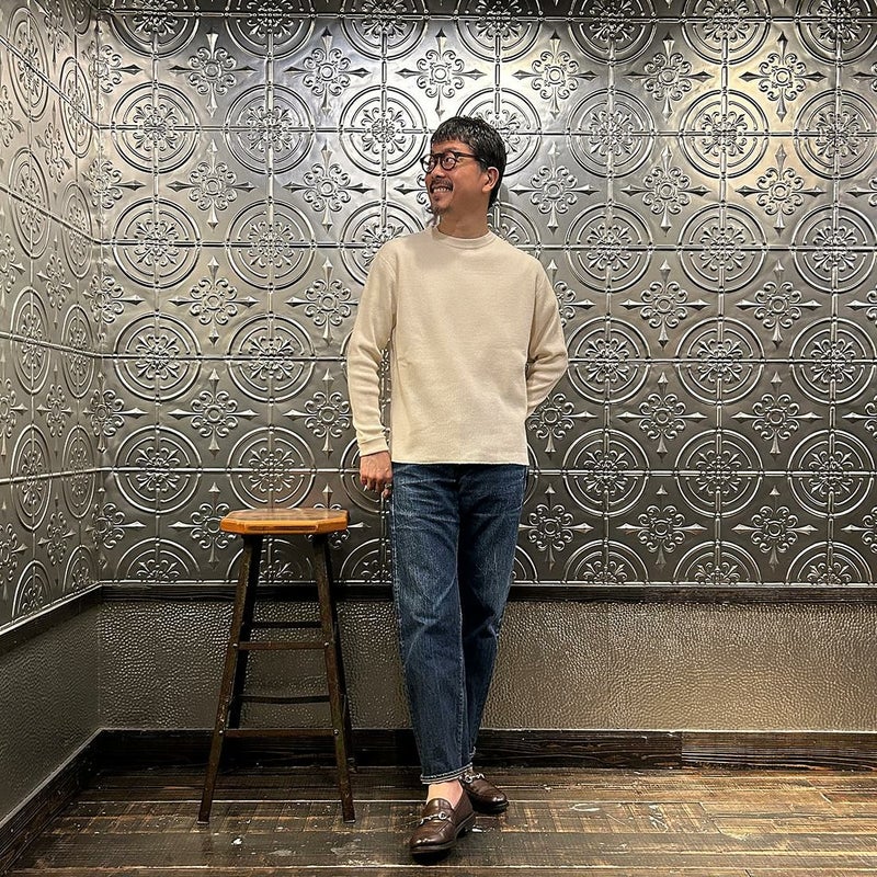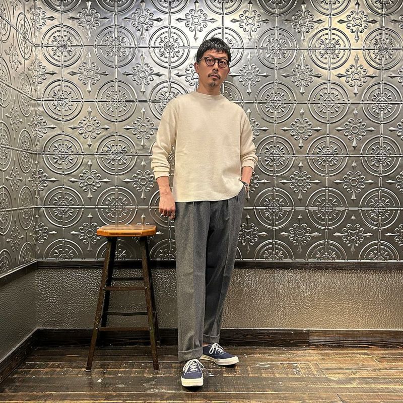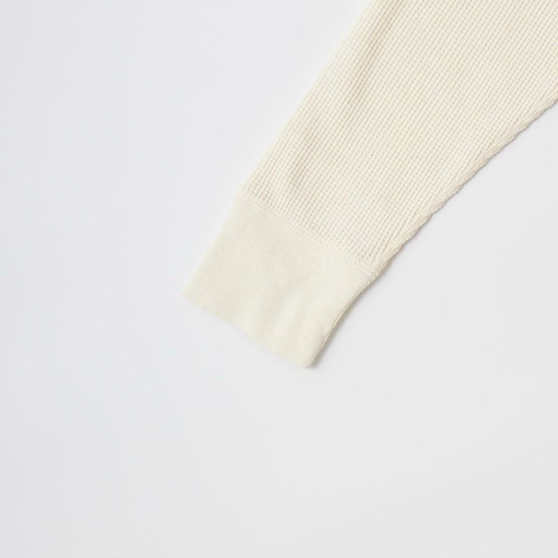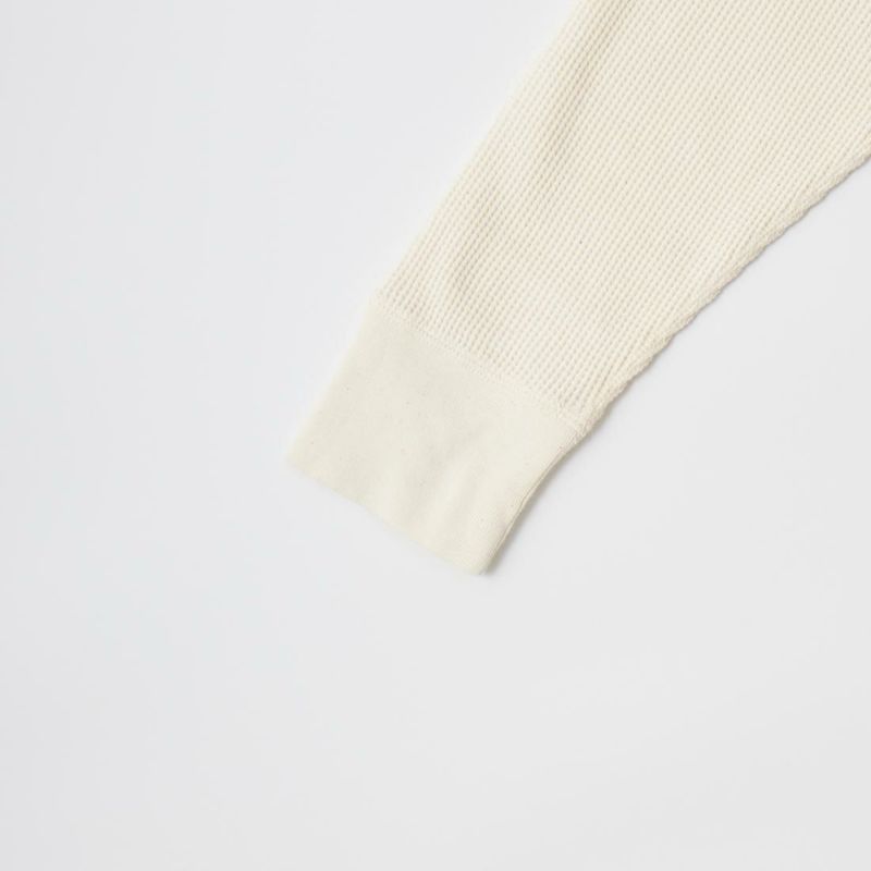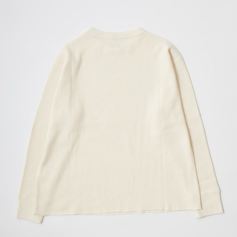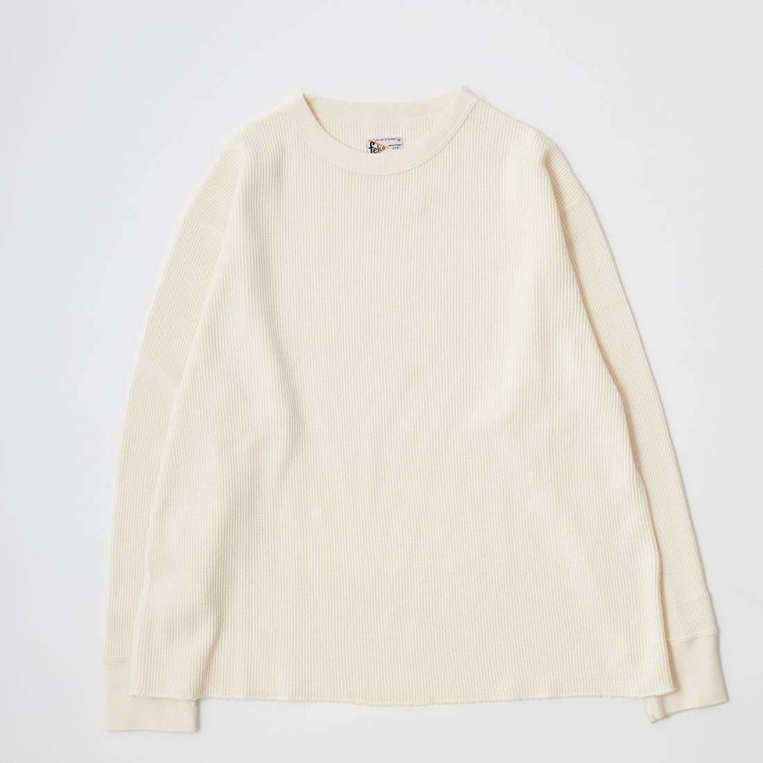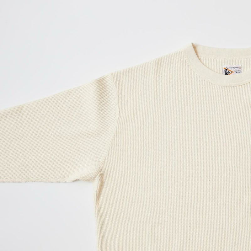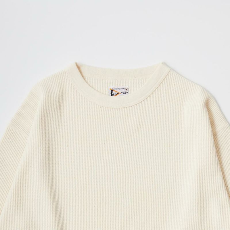 FELCO(フェルコ)のL/S THERMAL CREW MIDDLE WEIGHT。シンプルなデザインで使い勝手の良いサーマル素材のクルーネックの長袖Tシャツ。しっかりとしたバインダーネックの襟元。袖口はリブ仕上げ。程よい厚みで柔らかく伸縮性のあるコットン100%のサーマル素材を使用。ボックスシルエットで程良いゆとりがあり、インナーとしては勿論ですが単体でも活躍してくれる一枚。