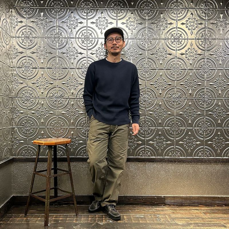 FELCO(フェルコ)のL/S THERMAL CREW MIDDLE WEIGHT。シンプルなデザインで使い勝手の良いサーマル素材のクルーネックの長袖Tシャツ。しっかりとしたバインダーネックの襟元。袖口はリブ仕上げ。程よい厚みで柔らかく伸縮性のあるコットン100%のサーマル素材を使用。ボックスシルエットで程良いゆとりがあり、インナーとしては勿論ですが単体でも活躍してくれる一枚。
