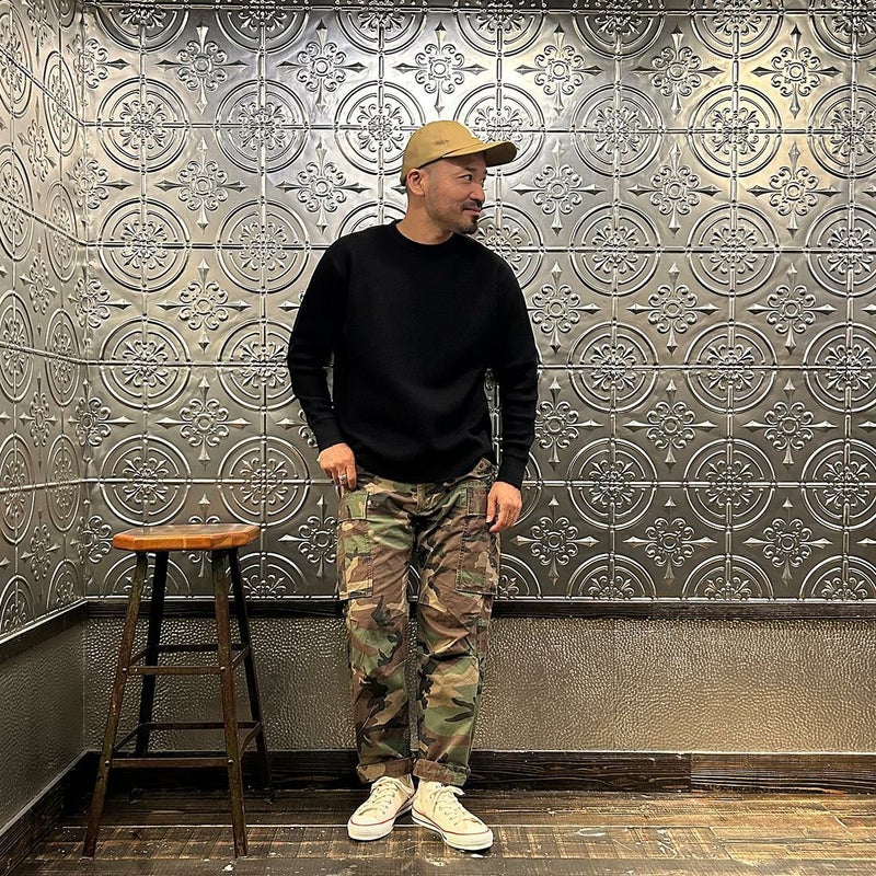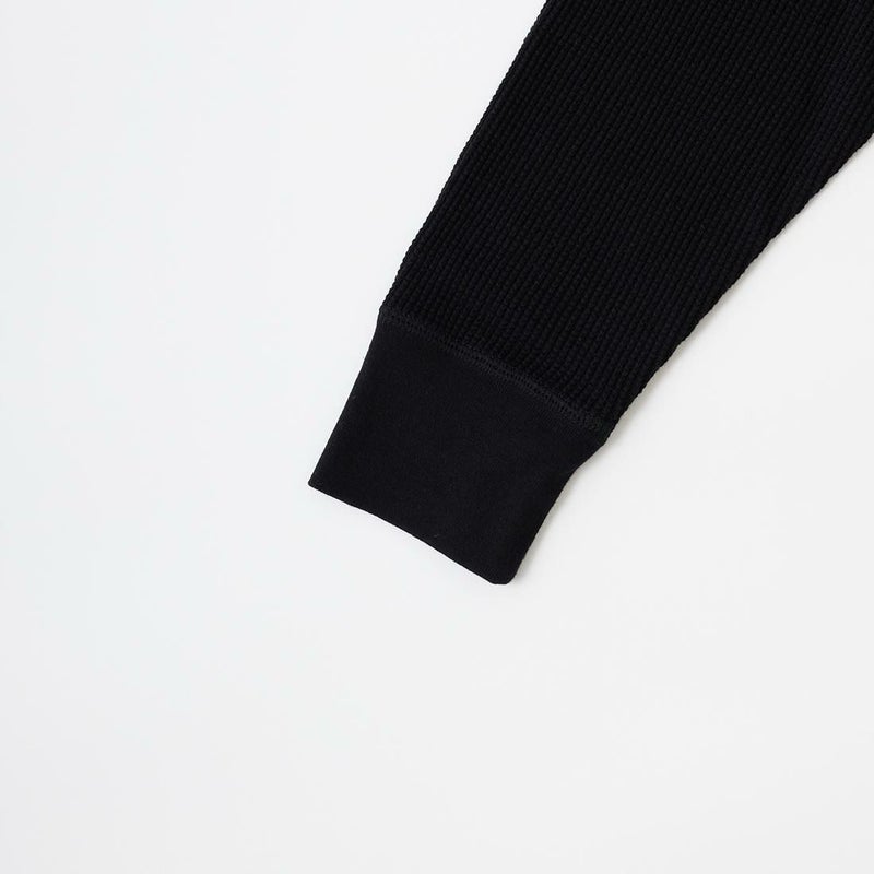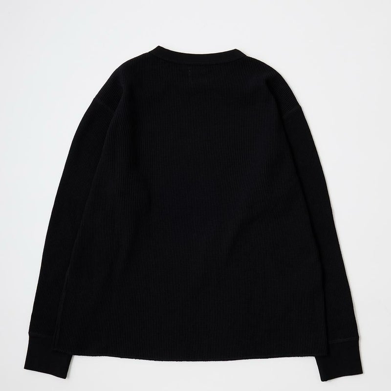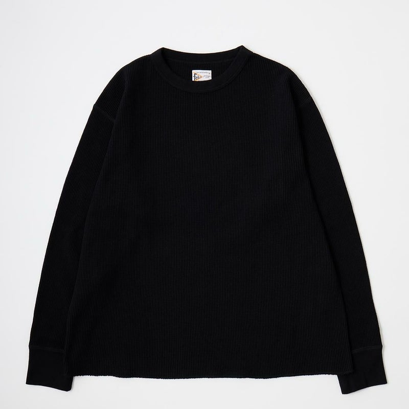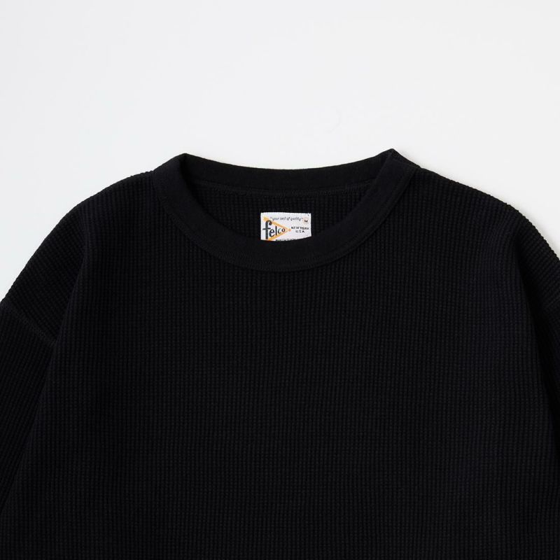 FELCO(フェルコ)のL/S THERMAL CREW MIDDLE WEIGHT。シンプルなデザインで使い勝手の良いサーマル素材のクルーネックの長袖Tシャツ。しっかりとしたバインダーネックの襟元。袖口はリブ仕上げ。程よい厚みで柔らかく伸縮性のあるコットン100%のサーマル素材を使用。ボックスシルエットで程良いゆとりがあり、インナーとしては勿論ですが単体でも活躍してくれる一枚。