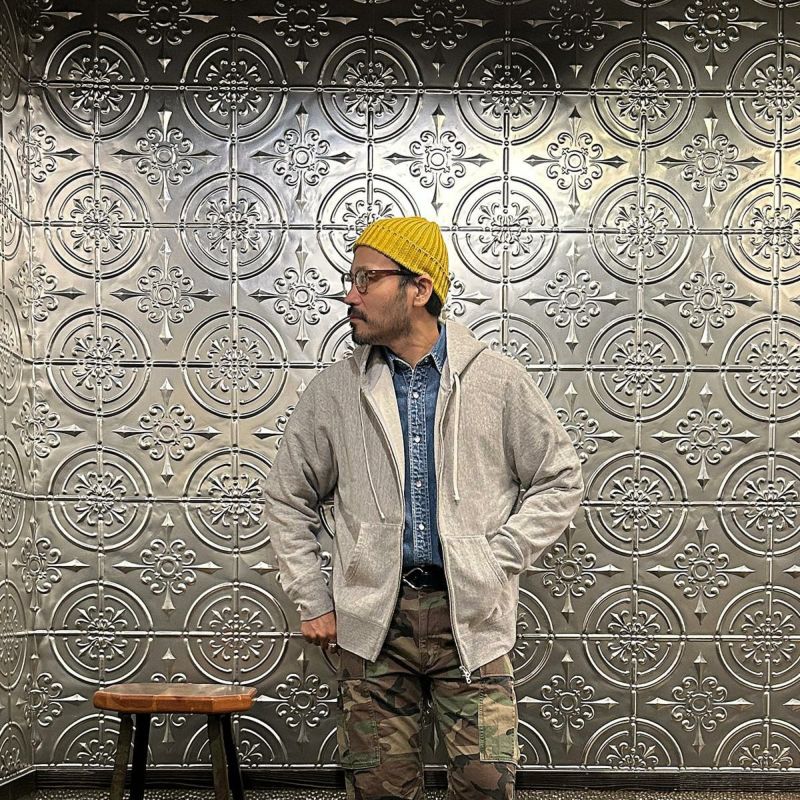 FELCO(フェルコ)のCLASSIC FIT INVERSE WEAVE FULL ZIP PARKA KANGAROO POCKET 10oz FRENCH TERRRY。10オンスのフレンチテリー(裏起毛していないスウェット生地)素材を使用したフルジップパーカー。生地を横向きに使用することで縦の縮みを軽減し、サイドリブが横縮み防止と動きやすさを実現したインバースウィーブの仕様。ダブルジップで着易く、正面にはカンガルーポケット付き。アウターとしては勿論、重ね着にも使い易いウェイトで、春・秋・冬と幅広く使える汎用性の高い1着。