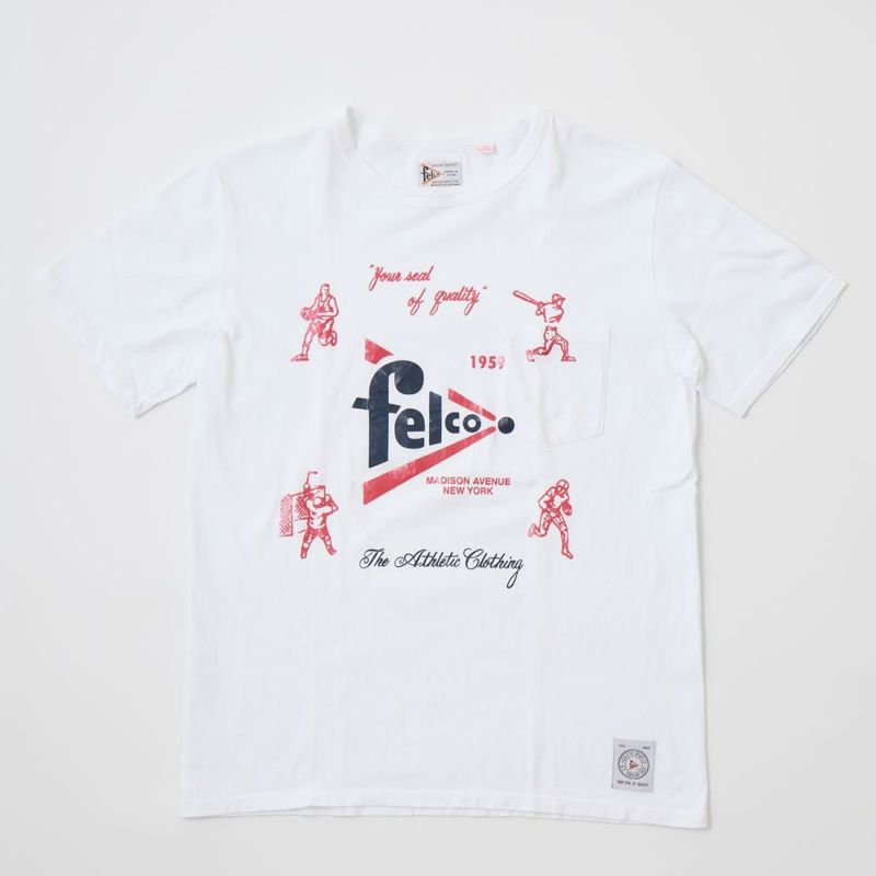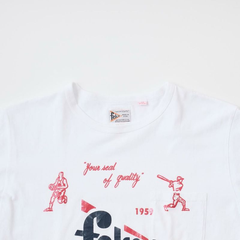 アメリカ発「FELCO」のS/S CREW NECK POCKET T SHIRT。縫い目のない丸胴ボディのクルーネックポケットT。アスレチックブランドであるFELCOらしい、野球・アメフト・アイスホッケー・バスケットボールのスポーツプリントがデザインされています。やや短めの着丈でリラックス感のある、アメリカらしいボックスシルエットが特徴です。年々減少しつつあるアメリカ製というのも大きな魅力。クルーネックはバインダーの仕様で伸びにくく、ヘビーに使って頂けます。こちらはアスレチックブランドであるFELCOらしい、野球・アメフト・アイスホッケー・バスケットボールのスポーツプリントがデザインされています。またプリントはラバープリント仕様で、着込んでいくうちにひび割れがでてくるのでヴィンテージ感も楽しんで頂けます。