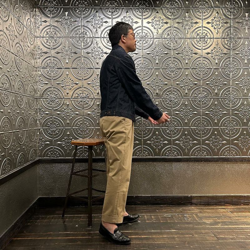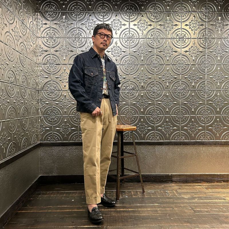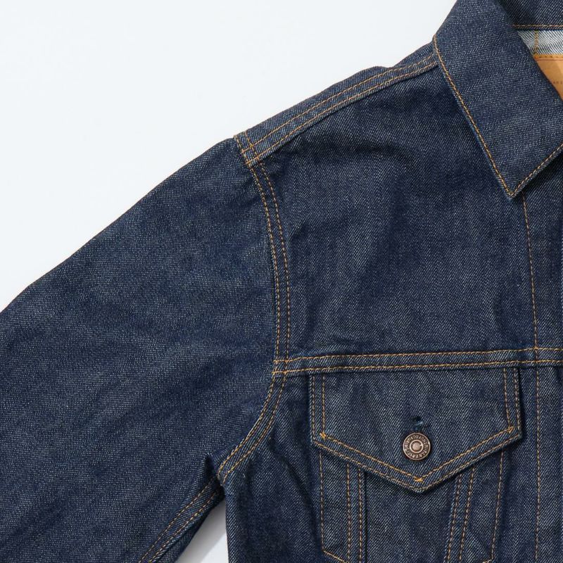 RESOLUTE(リゾルト)のデザイナー林 芳亨氏が監修したFAR EAST MANUFACTURING(ファーイーストマニュファクチャリング)のTRUCKER JACKET。1970年代のリーバイスのデニムジャケット「70505」がデザインソース。ヴィンテージよりも着やすくする為に着丈を長くアレンジ。胸の左右にフラップ付きポケット。後ろの腰部分にはアジャスターを装備。サンフォライズド(防縮加工)のリゾルトの712の生地を使用。
