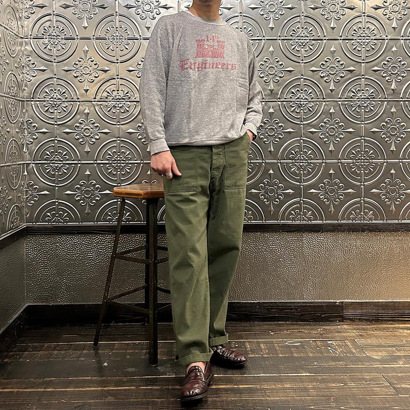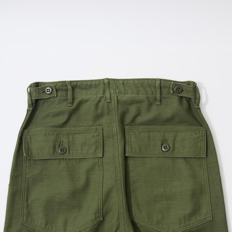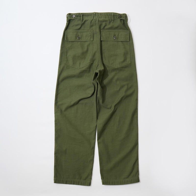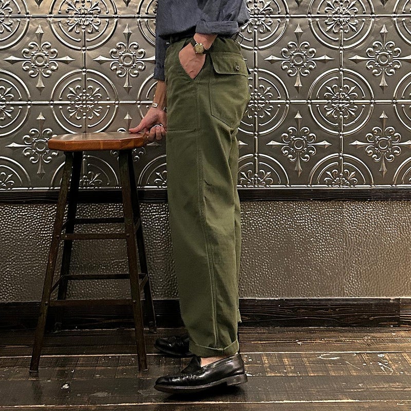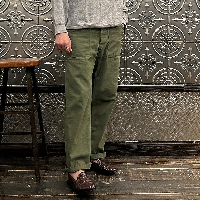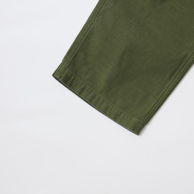 RESOLUTE(リゾルト)のデザイナー林 芳亨氏が監修したFAR EAST MANUFACTURING(ファーイーストマニュファクチャリング)のUTILITY PANT。バックサテンを使用したユーティリティーパンツ。アメリカ軍の60年代半ばのユーティリティパンツ(ベイカーパンツ)がデザインソース。フロントの大きめのパッチポケットが特徴の股上深めのストレートシルエット。オリジナルで開発したバックサテンはスレン染めで洗濯や日光への堅牢度が強く、オリーブカラーを残しながら褪色。着るほどに体に馴染み、着用を重ねるごとに味わいが深くなる1本。