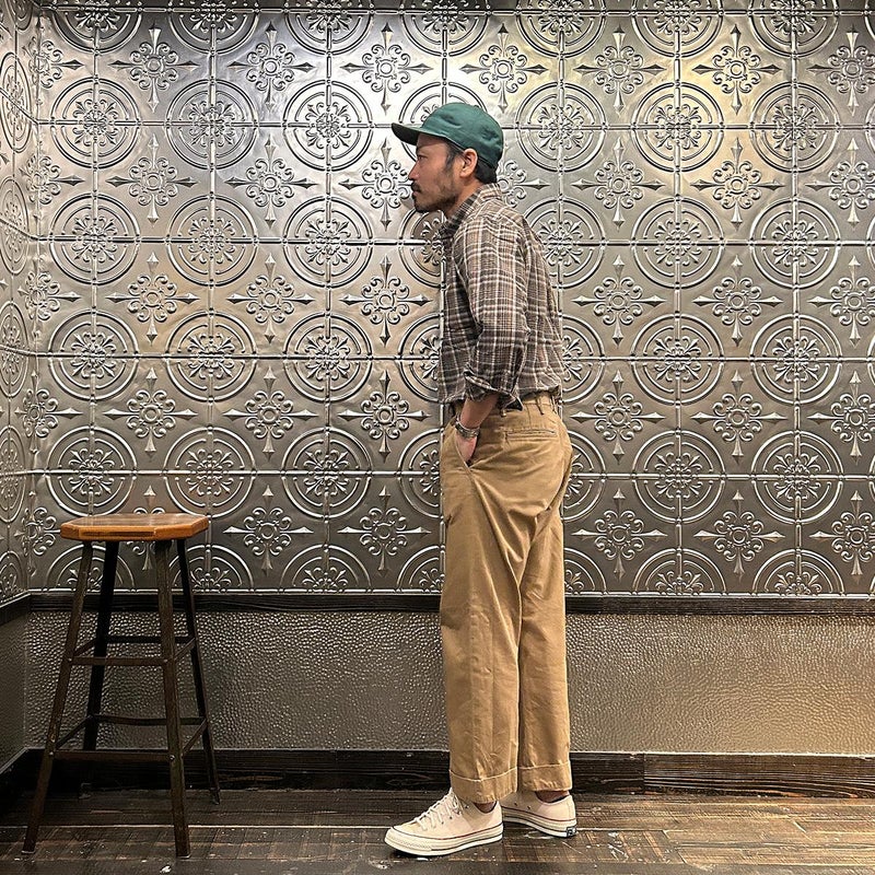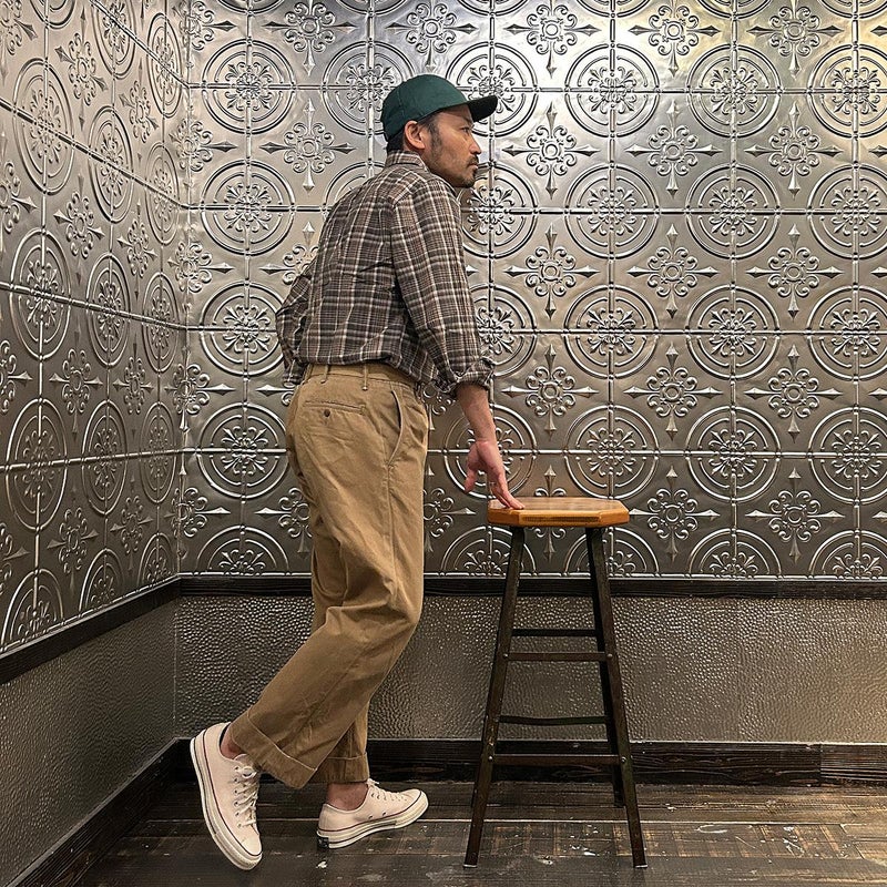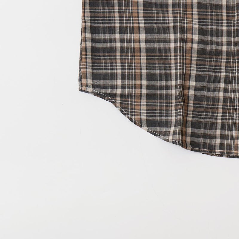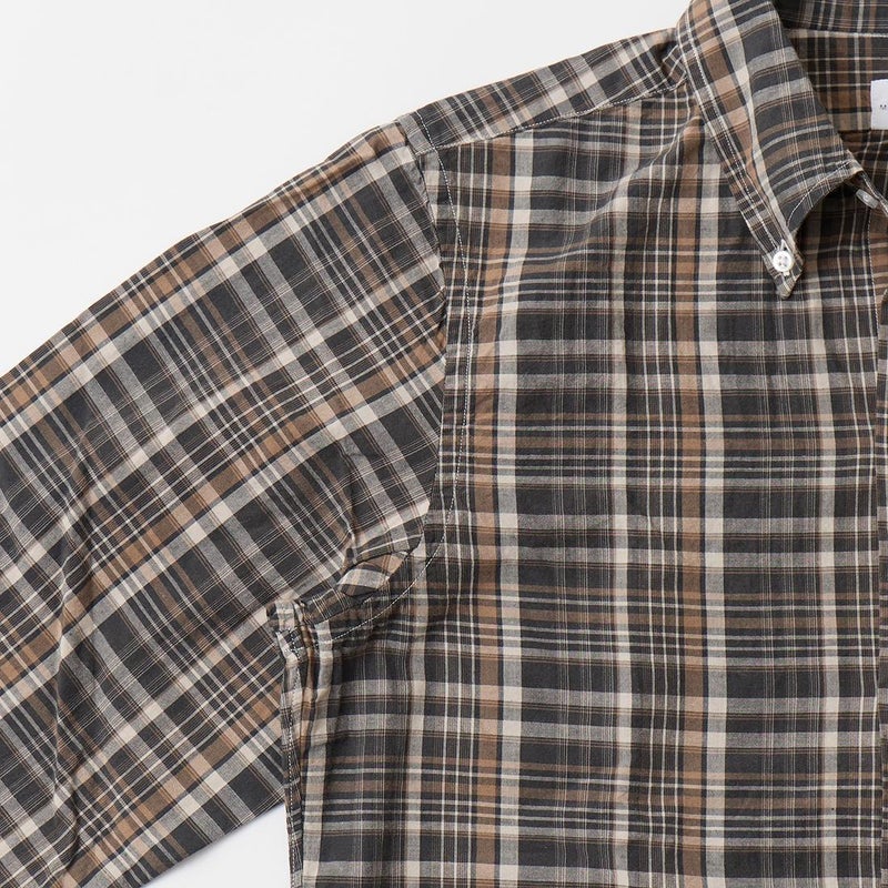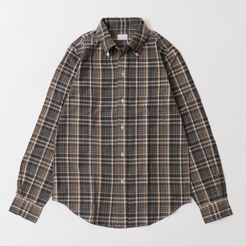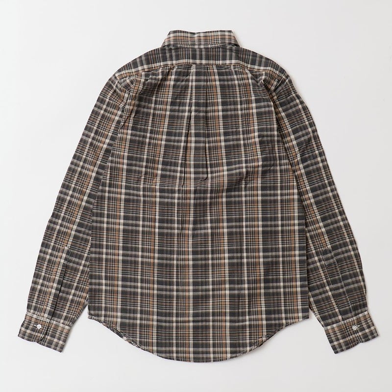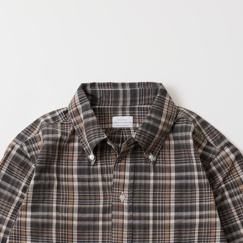 RESOLUTE(リゾルト)の林さんが監修したFAR EAST MANUFACTURING(ファーイーストマニュファクチャリング)のL/S COTTON MADRAS PLAID BD SHIRT。1970年代に販売されたボタンダウンシャツのアイコン的モデルのディテールを忠実に再現しながら、現代的なフィットに落とし込んだシャツ。フロントボタンは6ボタン仕様。袖下から脇にかけての巻き縫いは、ヴィンテージシャツの細い巻き縫いを再現。前立て裏のチェーンステッチは、シャツ専用のユニオンスペシャルのミシンを使用するなど拘りの縫製仕様。芯地を極力省くことで、堅すぎず、柔らかすぎない着心地の良い仕上がり。生地はシーズンファブリックのマドラスチェック生地。生地にブリーチを施し最初から雰囲気良く退色した風合い。ジャストサイズをお選びいただけるように一つのネックサイズに対して、4サイズの裄丈(袖丈)を展開。
