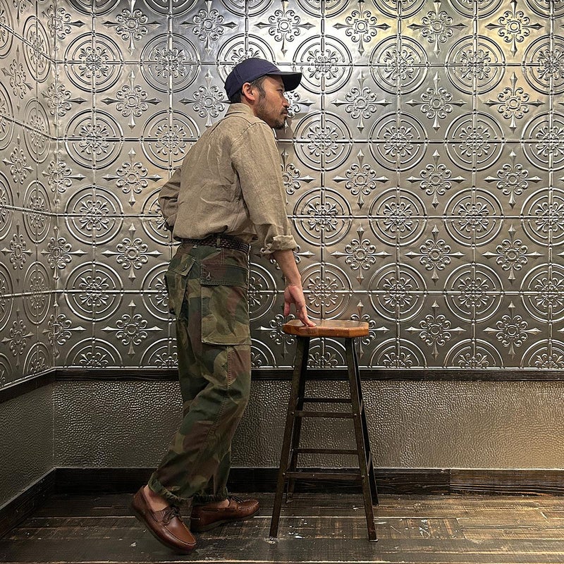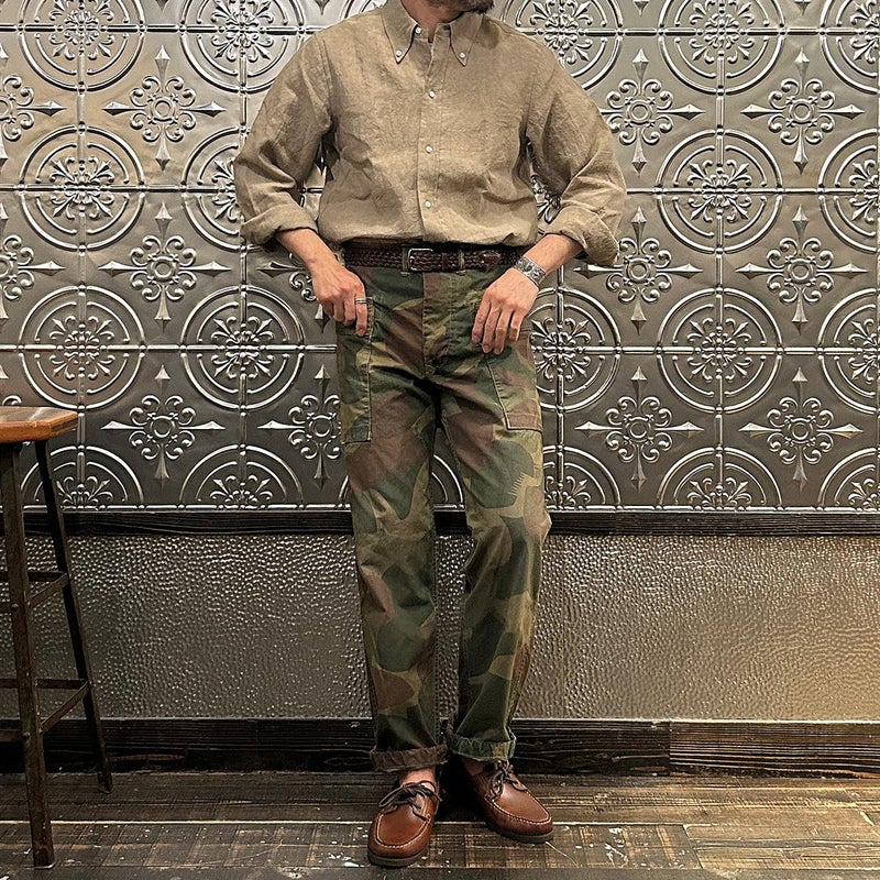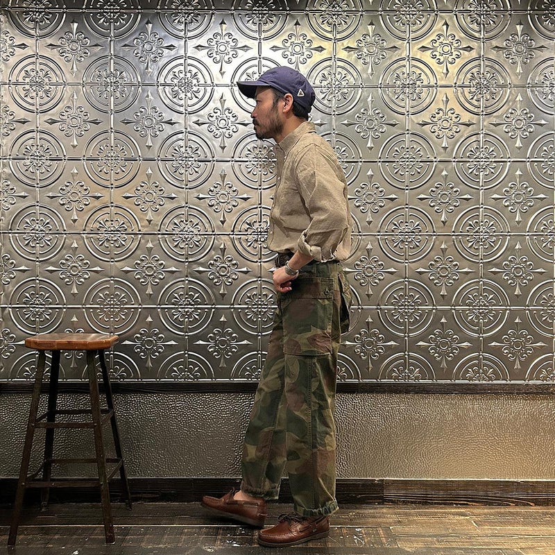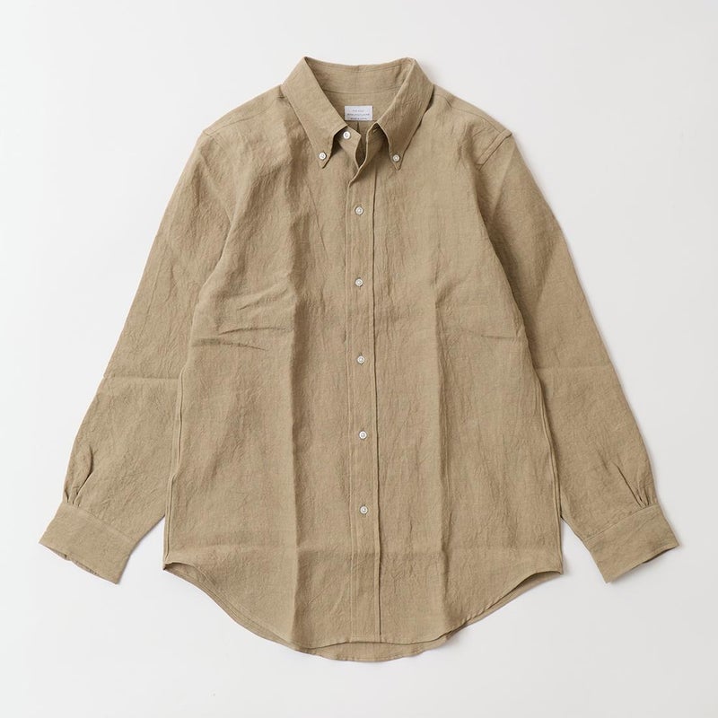RESOLUTE(リゾルト)の林さんが監修したFAR EAST MANUFACTURING(ファーイーストマニュファクチャリング)のL/S LINEN SUN DRYING BD SHIRT。1970年代に販売されたボタンダウンシャツのアイコン的モデルのディテールを忠実に再現しながら、現代的なフィットに落とし込んだシャツ。フロントボタンは6ボタン仕様。袖下から脇にかけての巻き縫いは、ヴィンテージシャツの細い巻き縫いを再現。前立て裏のチェーンステッチは、シャツ専用のユニオンスペシャルのミシンを使用するなど拘りの縫製仕様。芯地を極力省くことで、堅すぎず、柔らかすぎない着心地の良い仕上がり。生地はシーズンファブリックの少し褐色したような色合いで独特のシャリ感のあるリネン。ジャストサイズをお選びいただけるように一つのネックサイズに対して、4サイズの裄丈(袖丈)を展開。