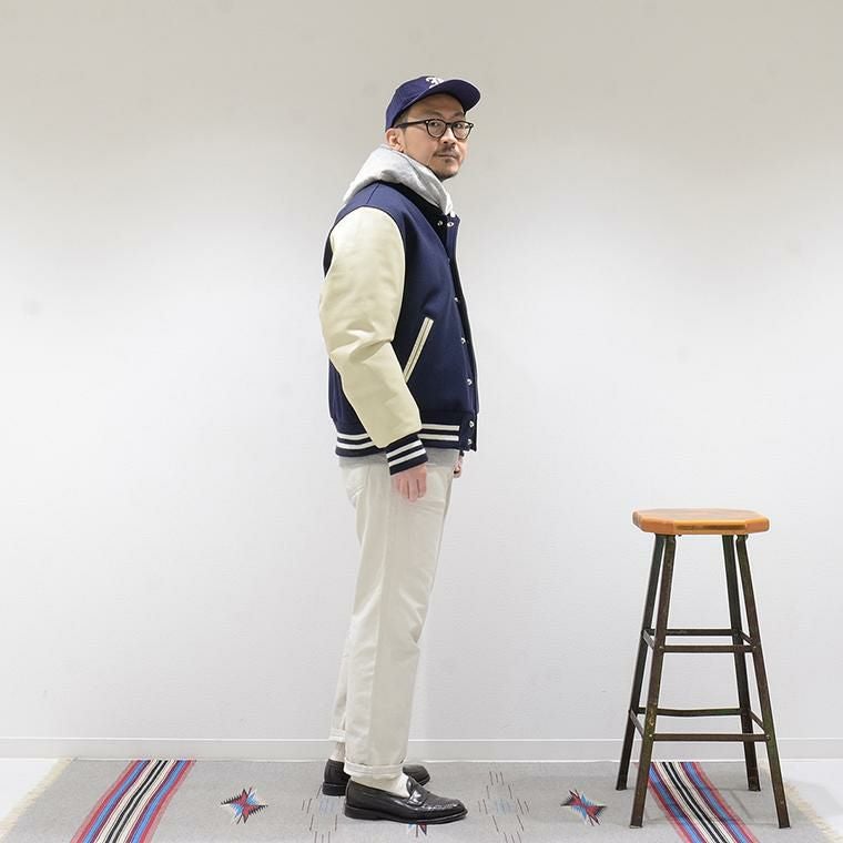 アメリカ発「GB SPORTS(ジービースポーツ)」のCLASSIC FIT SNAP FRONT WOOL LEATHER VARSITY JACKET QUILT LINING。ブランドが得意とするバーシティジャケット(所謂スタジアムジャンバー)にカラーを別注したモデルです。襟はショールカラー仕様。袖と裾は往年のバーシティジャケットらしく2本ラインの入ったリブが付きます。また、身頃はメルトンウール、袖はカウレザーを採用した2トーン仕様。素材と色の組み合わせで旧き良き「スタジャン」的な雰囲気の良い一着に仕上がっています。今季はクラシックフィットを採用。全体的にゆったりとシルエットが新鮮な感じでストレスのない着用感もポイント。裏地は身頃・袖ともにキルティング仕様になっているので保温性も期待できアウターとしての機能をしっかりもっています。絶妙なサイズバランスと飽きの来ないシンプルなデザインを兼ね備えた、末永く愛用して頂けるお薦めのジャケットです。