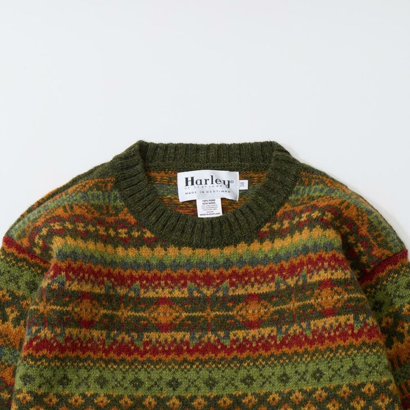 HARLEY OF SCOTLAND(ハーレーオブスコットランド)のALL OVER FAIRISLE CREW SWEATER。全面フェアアイル柄のクルーネックニット。ハーレーオブスコットランドではあまりリリースされていないタイプの柄編み仕様。コーディネートのちょっとしたアクセントに最適な1着。