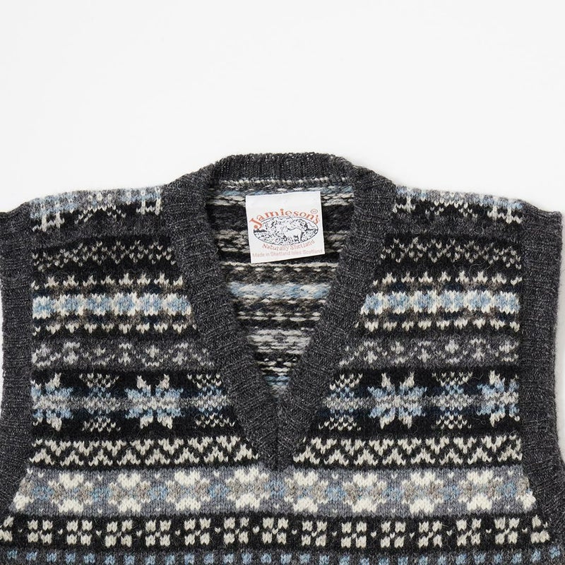 JAMIESON'S(ジャミーソンズ)のAOFI VEE NECK SLIPOVER。お馴染みのVネックのフェアアイルベスト。スコットランド・シェットランド諸島産の上質な羊毛を植物染色し、色鮮やかな幾何学模様に編み立てたフェアアイルニット。 美しい発色とナチュラルな柔らかい風合い、軽くて暖かい着心地が特徴的なベストです。ミドルゲージのニットになるのでアウター、インナーどちらでも対応可能。スタイリングのアクセントとして取り入れやすいオススメの1着です。
