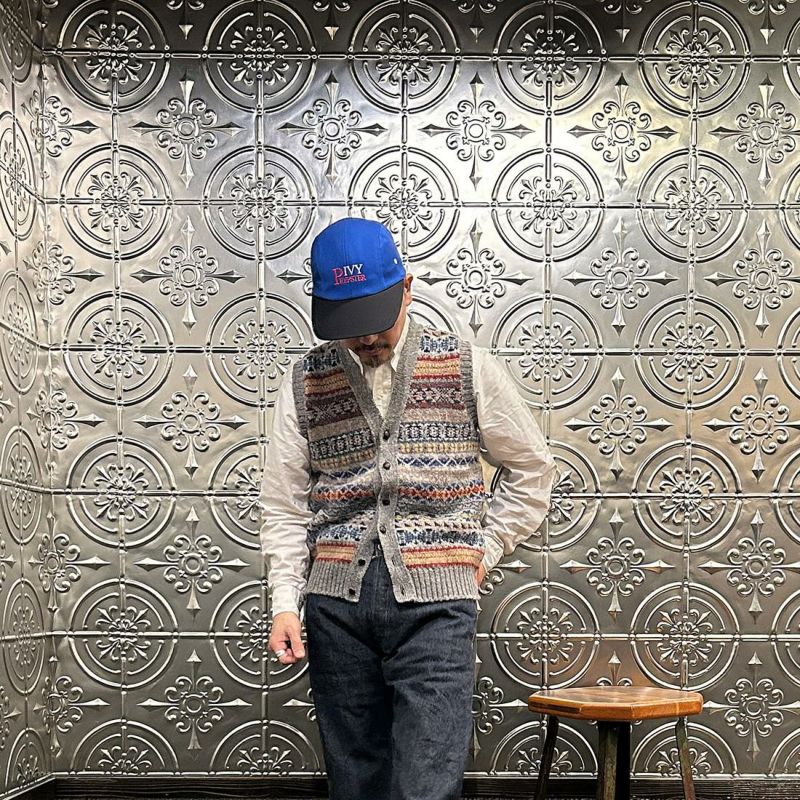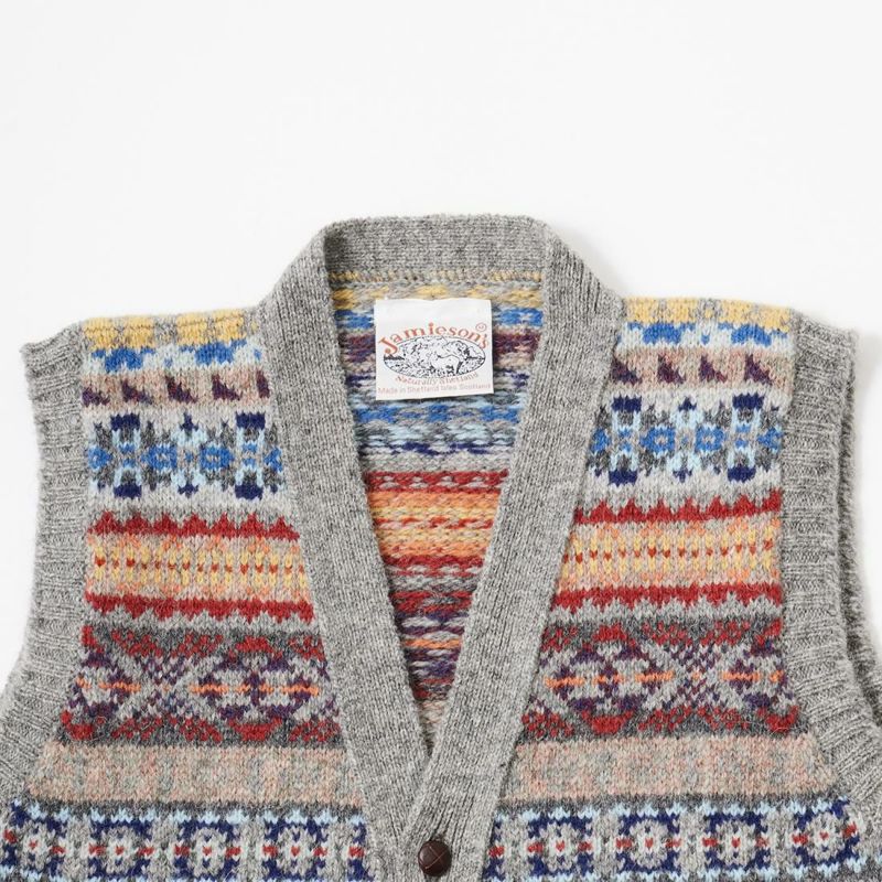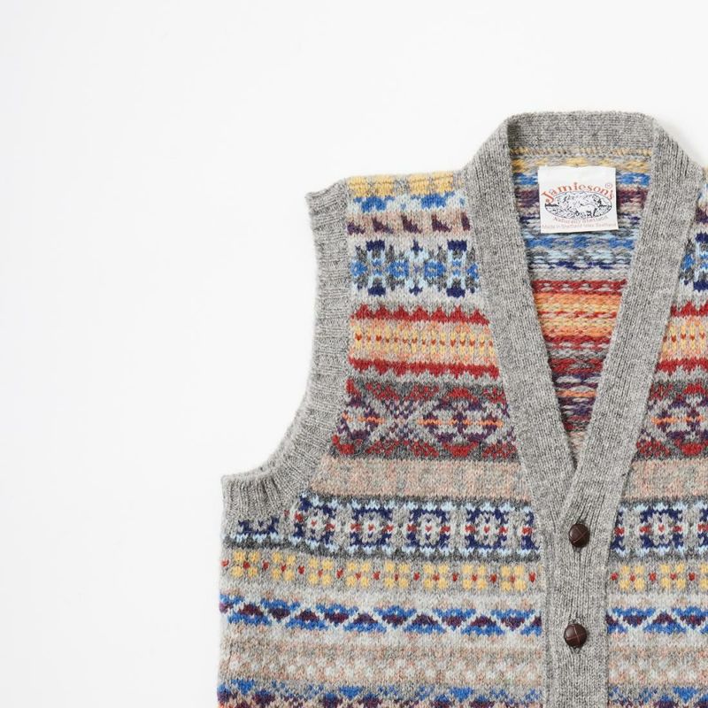 JAMIESON'S(ジャミーソンズ)のAOFI VEE NECK WAISTCOAT。ボタンフロントのフェアアイルベスト。スコットランド・シェットランド諸島産の上質な羊毛を植物染色し、色鮮やかな幾何学模様に編み立てたフェアアイルニット。 美しい発色とナチュラルな柔らかい風合い、軽くて暖かい着心地が特徴的なベストです。小ぶりなクルミボタンがより「雰囲気」を醸し出しています。ミドルゲージのニットになるのでアウター、インナーどちらでも対応可能。スタイリングのアクセントとして取り入れやすいオススメの1着です。