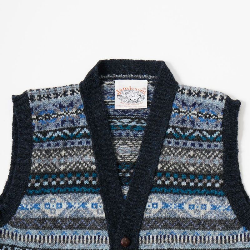 JAMIESON'S(ジャミーソンズ)のAOFI VEE NECK WAISTCOAT。ボタンフロントのフェアアイルベスト。スコットランド・シェットランド諸島産の上質な羊毛を植物染色し、色鮮やかな幾何学模様に編み立てたフェアアイルニット。 美しい発色とナチュラルな柔らかい風合い、軽くて暖かい着心地が特徴的なベストです。小ぶりなクルミボタンがより「雰囲気」を醸し出しています。ミドルゲージのニットになるのでアウター、インナーどちらでも対応可能。スタイリングのアクセントとして取り入れやすいオススメの1着です。