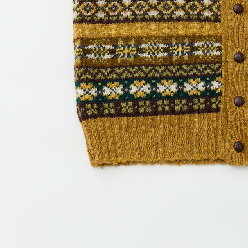 JAMIESON'S(ジャミーソンズ)のAOFI VEE NECK WAISTCOAT。ボタンフロントのフェアアイルベスト。スコットランド・シェットランド諸島産の上質な羊毛を植物染色し、色鮮やかな幾何学模様に編み立てたフェアアイルニット。 美しい発色とナチュラルな柔らかい風合い、軽くて暖かい着心地が特徴的なベストです。小ぶりなクルミボタンがより「雰囲気」を醸し出しています。ミドルゲージのニットになるのでアウター、インナーどちらでも対応可能。スタイリングのアクセントとして取り入れやすいオススメの1着です。