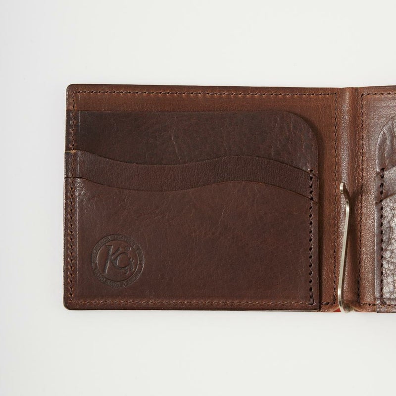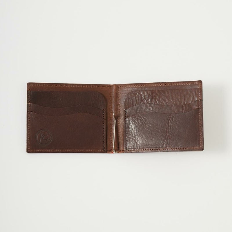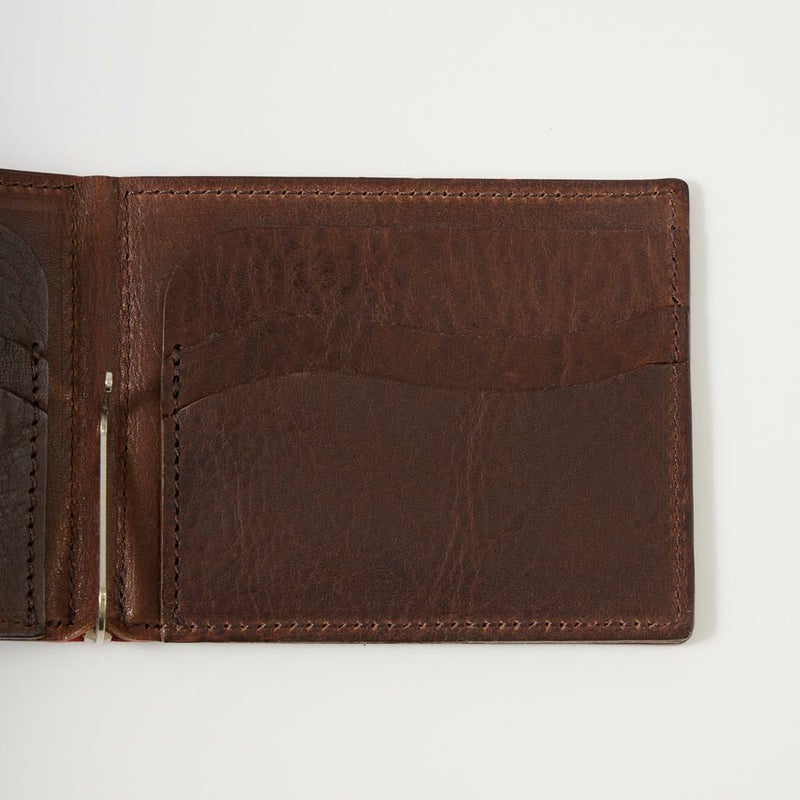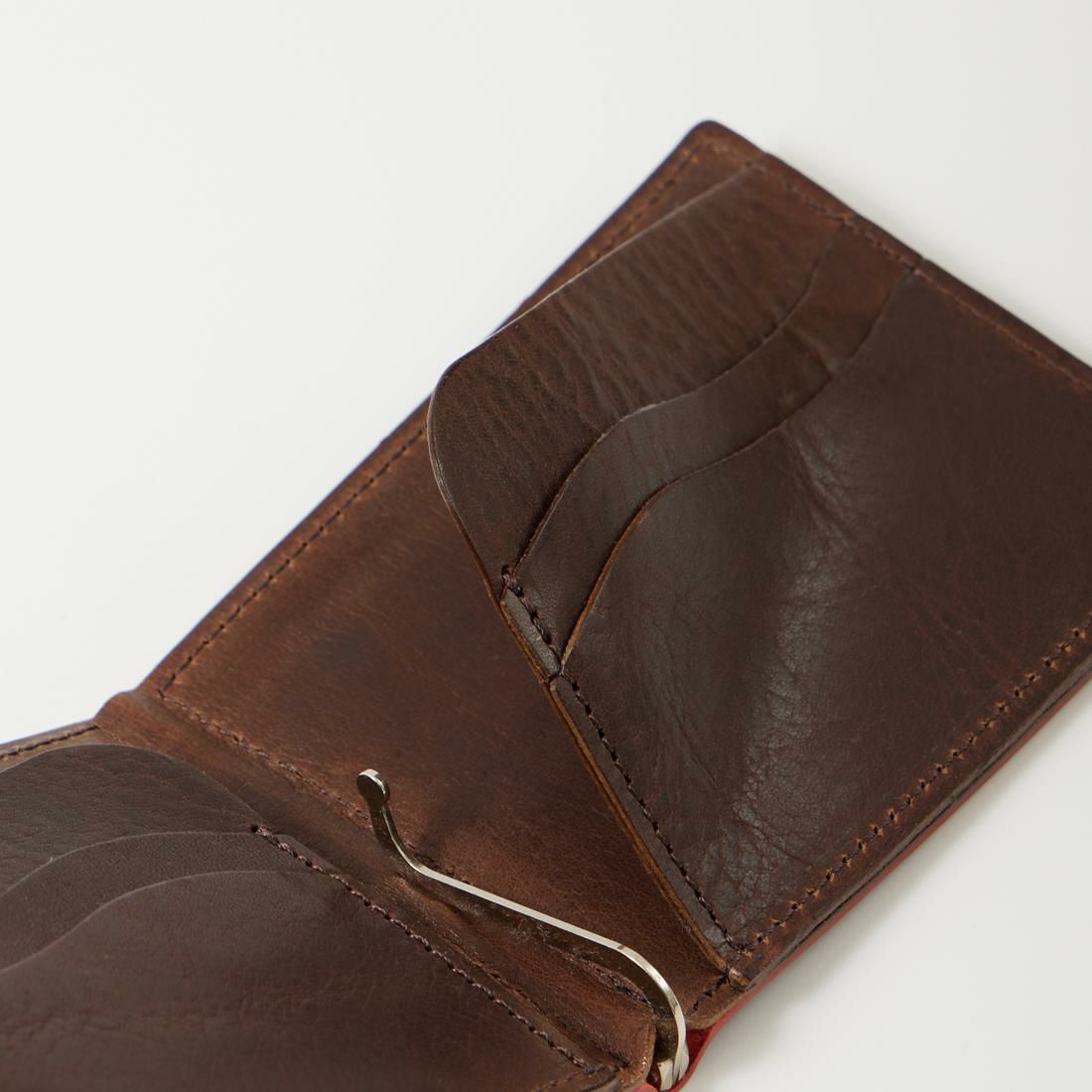 KC,S LEATHER CRAFT(ケイシイズレザークラフト)のMONEY CLIP CAVALLO CORDOVAN。結晶のような輝きと色の深みが魅力のオイルコードバンを使用したマネークリップ。取れる量が極めて少量なので、非常に希少性の高いレザーとされているコードバン。強度の高いレザーとなり使い込むほどに柔らかく馴染み、経年変化も楽しんで頂けます。2つ折りタイプでお札をクリップで挟んで使うタイプのマネークリップ。マネークリップにしては珍しくカードホルダーも装備しているので収納力もあります。職人がハンドメイドで作るクラフト感あふれる逸品です。