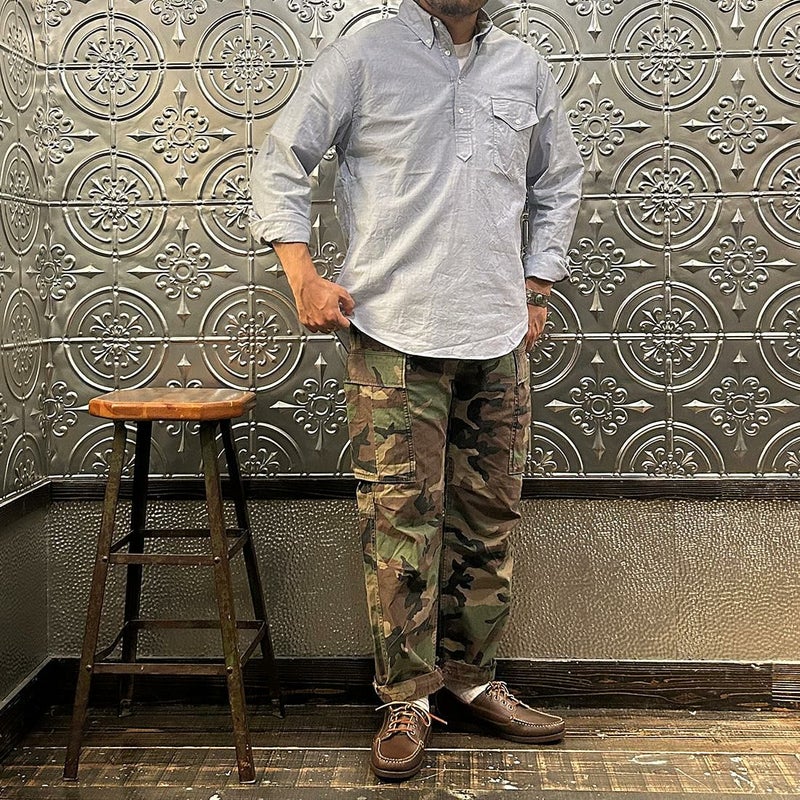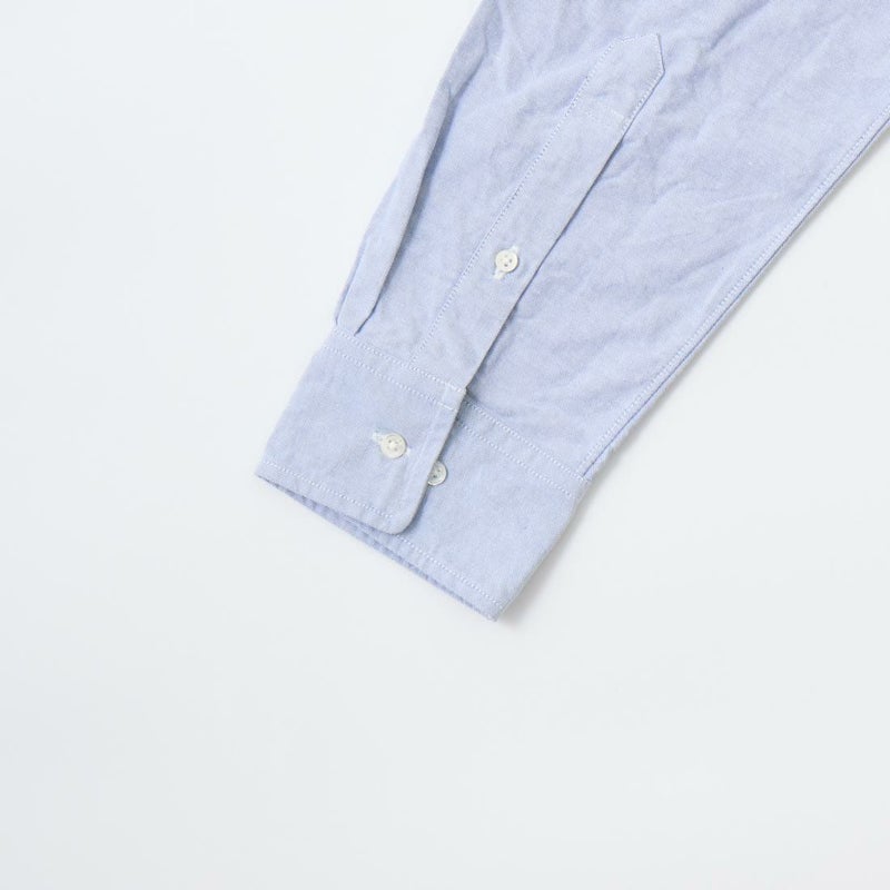 170センチ68キロやや肩幅広めの私の体型でサイズ選びはMサイズでゆったりとした丁度良い着用感です。身幅、アームホール、肩幅は広めにつくられていることから脱ぎ着し易い仕上がり。素材はシーズン問わず使って頂ける使い勝手の良い軽めのオックスフォード生地を使用。洗いかかっていることで大きな縮みもなく着続けられるのも嬉しい1着。流行り廃りのないシンプルなプルオーバーボタンシャツ。アメトラ、アイビー、スポーツスタイル好きな方には心擽られる1着です。