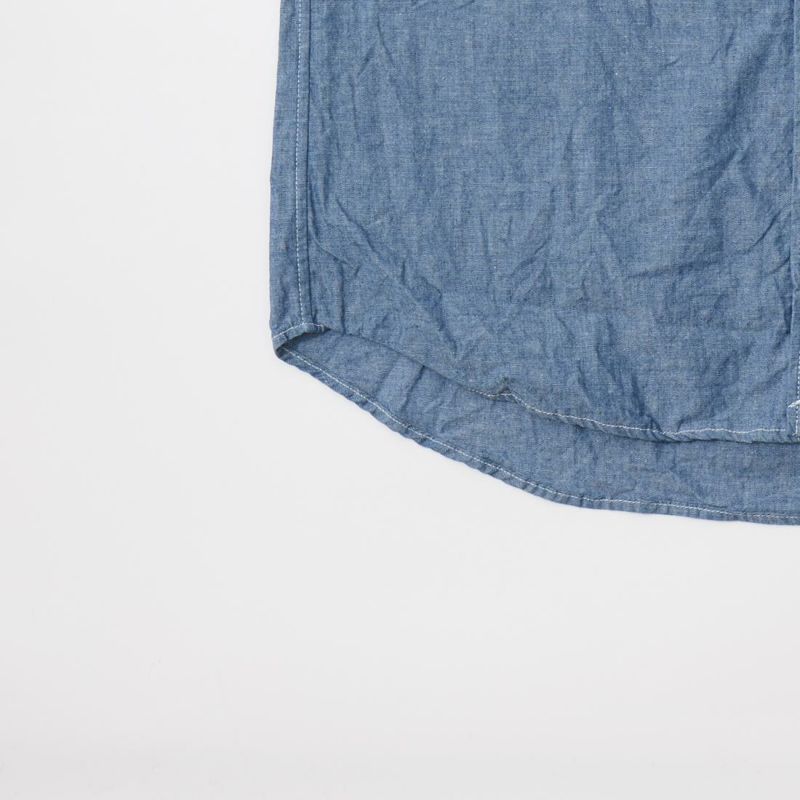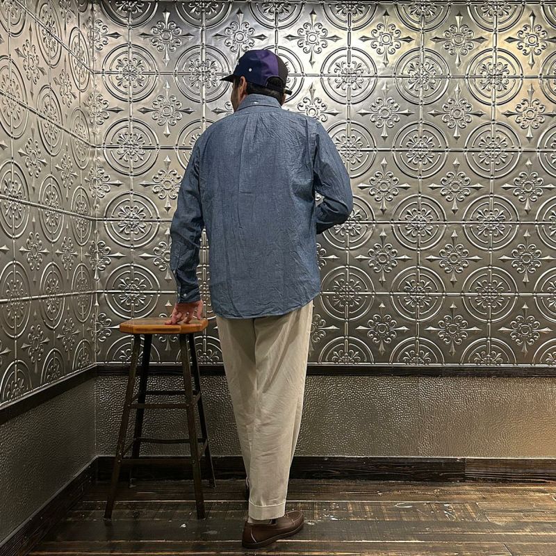 KEATON CHASE USA(キートンチェイスUSA)のL/S CLASSIC FIT FULLOPEN BD SHIRT 5oz INDIGO CHAMBRAY。日本生産ラインのフルオープンの長袖ボタンダウンシャツ。左胸にフラップポケットが配置。背面はボックスプリーツ仕様。襟の後ろにはチョークボタン付き。程よいゆとりのクラシックフィット。素材は程よいハリコシのある5オンスのコットンシャンブレー素材を使用。