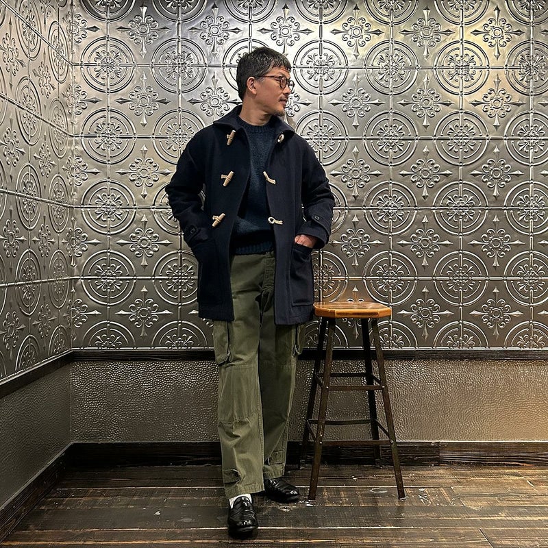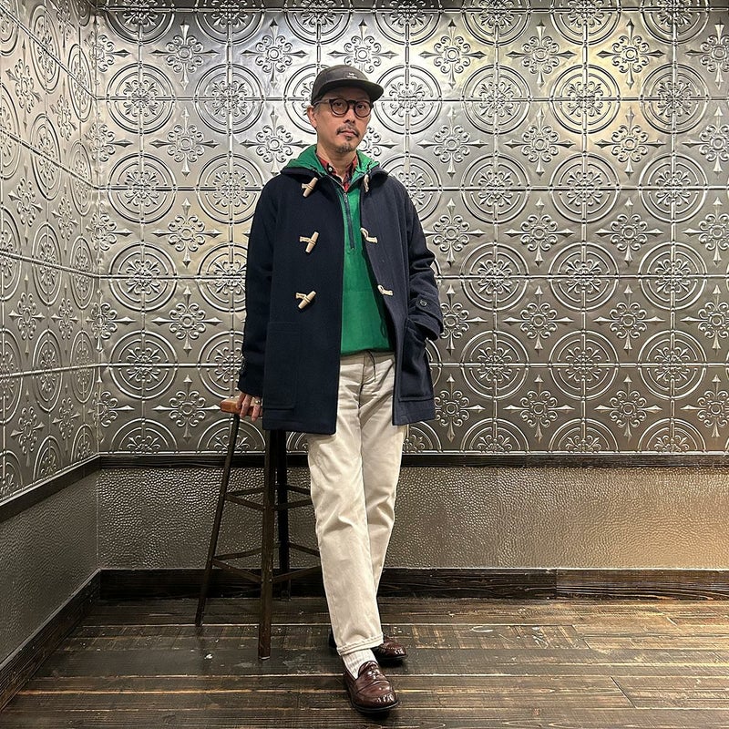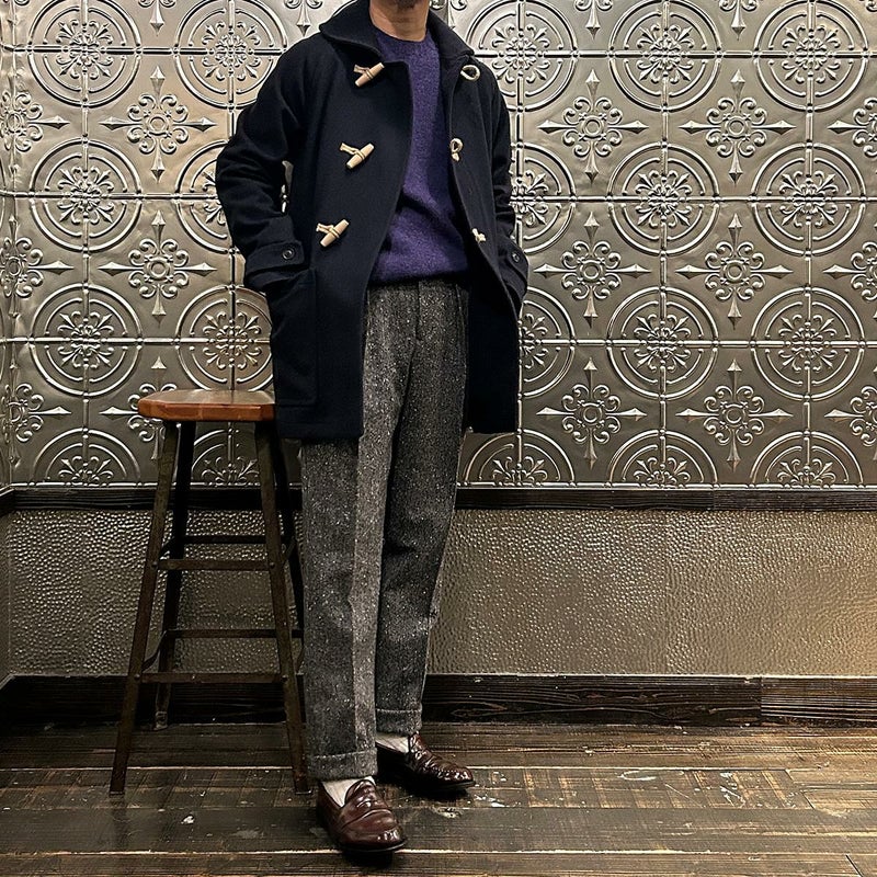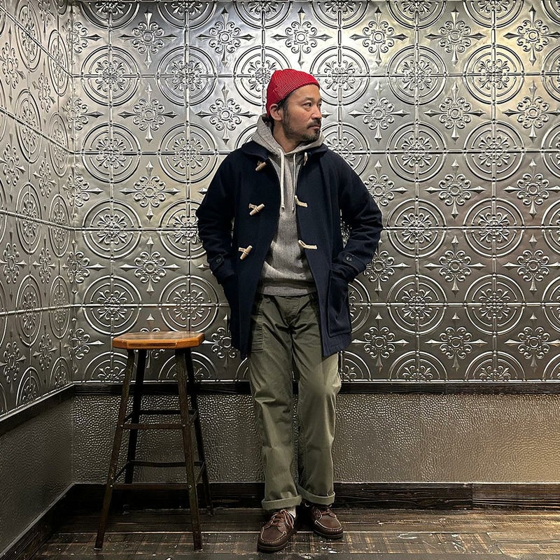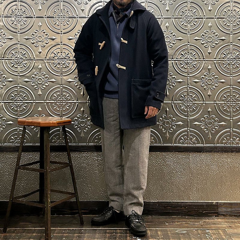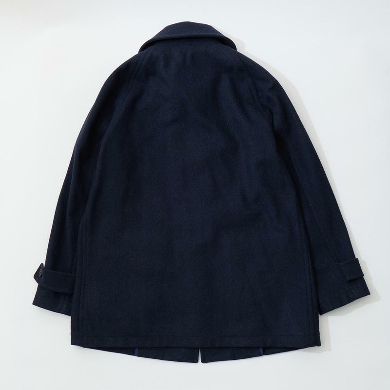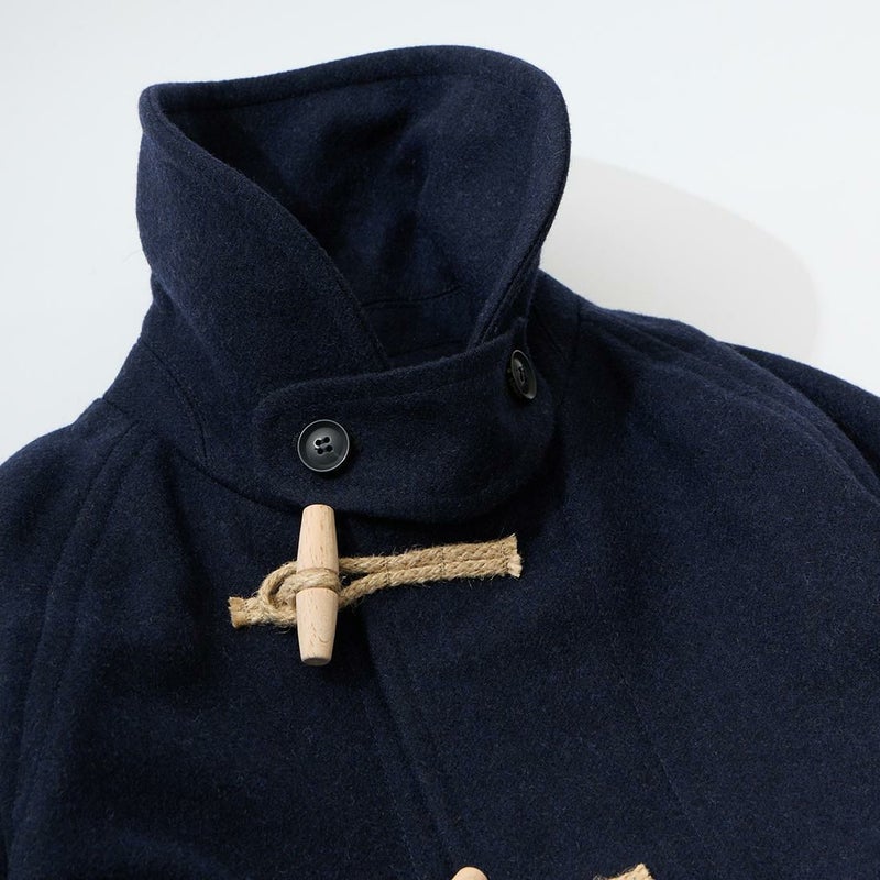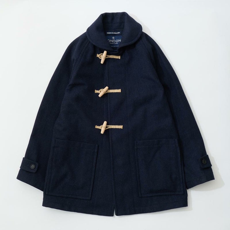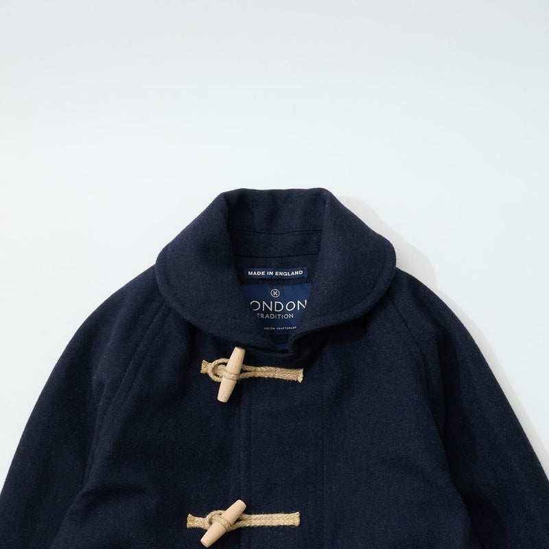 LONDON TRADITION(ロンドントラディション)の RAGLAN SLEEVE DUFFLE COAT。 ライトウェイトのメルトンウール一重仕立て(裏地なし)のダッフルコート。 襟元はチンストラップ付のショールカラー。 素朴な麻紐と白木トグル。 ダッフルコートでは珍しいラグランスリーブ仕様。腰部分の大きめのパッチポケット。 お尻隠れるくらいのミディアムレングス。 この手のウールダッフルコートにしては着始めから体に馴染みやすく着易いのが特徴。