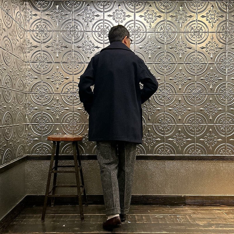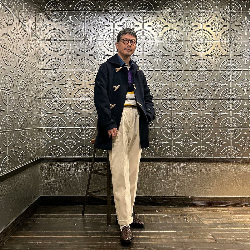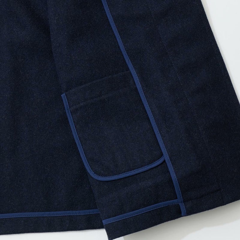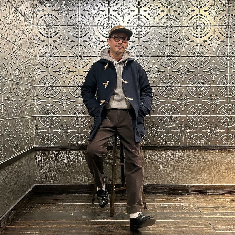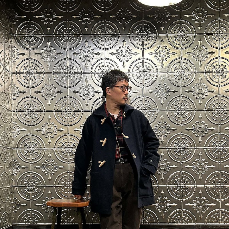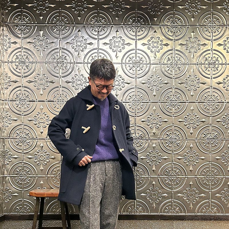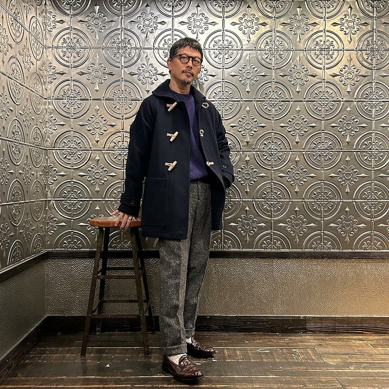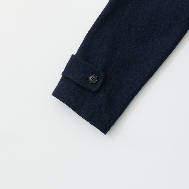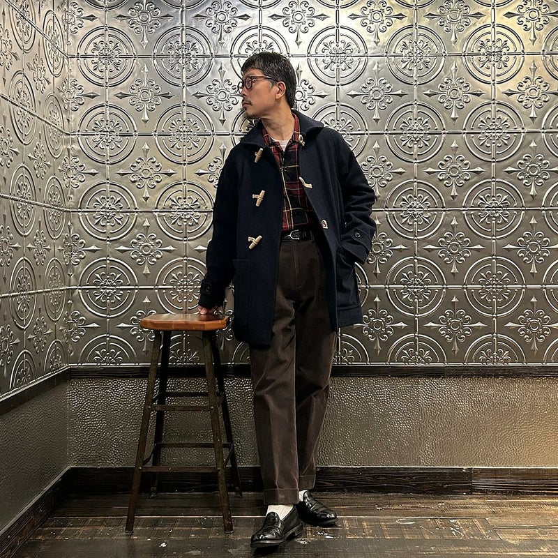 LONDON TRADITION(ロンドントラディション)の RAGLAN SLEEVE DUFFLE COAT。 ライトウェイトのメルトンウール一重仕立て(裏地なし)のダッフルコート。 襟元はチンストラップ付のショールカラー。 素朴な麻紐と白木トグル。 ダッフルコートでは珍しいラグランスリーブ仕様。腰部分の大きめのパッチポケット。 お尻隠れるくらいのミディアムレングス。 この手のウールダッフルコートにしては着始めから体に馴染みやすく着易いのが特徴。