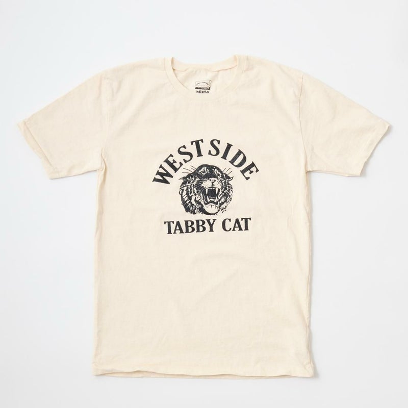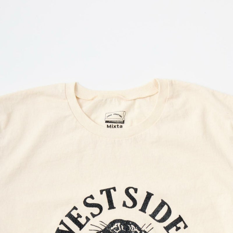 MIXTA(ミクスタ)のS/S PRINT TEE TOBBY CAT。クルーネックでセットインスリーブの半袖プリントTシャツ。1970~80年代のデッドストックのTシャツを徹底的に研究し再現したボディは、綿花のカスを敢えて残し生地を織り上げるという当時と同じ製法で作られたもの。糸の生産段階から染め加工に至るまで全てアメリカの自社工場にて行われています。首元はスッキリとしており、着丈が少し長めに作られています。ヴィンテージ感溢れる1着。