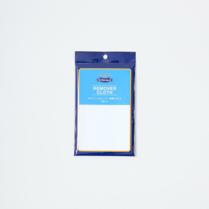シューケアブランドM.MOWBRAY(エム・モウブレイ)のREMOVER CLOTH 5枚入り。スムースレザーの靴用汚れ落とし「M.モゥブレィ・ステインリムーバー」使用する際に、使うクロス。目が細かい上質な国産の綿100%素材を使用。その他にも、スプレー製品をかけた後に使用したり、アビィ・レザースティックを巻きつけたり、靴のお手入れの際にマルチに使える便利なクロスです。