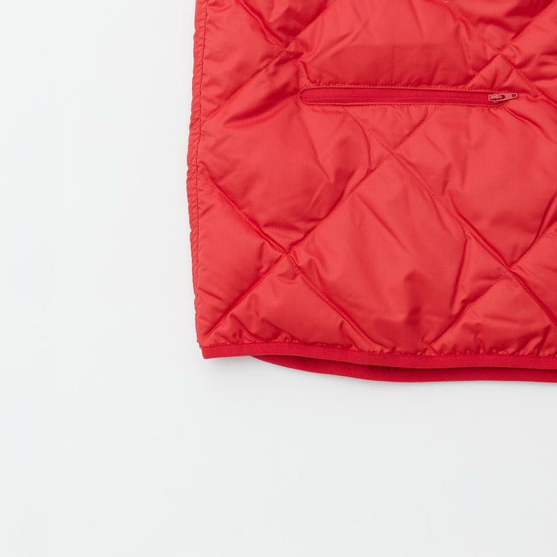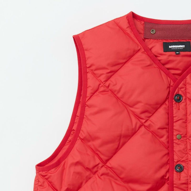 MODMNT(モドメント)のLINER DOWN VEST。表地に高密度に織り上げたマイクロファイバータフタを使用したライナーダウンベスト。インナーを選ばない開き具合のネックライン。ボタンとスナップが交互に配置された前立て。腰部分にはジップポケットを装備。スペイン産ホワイトダウン(国内洗浄)を40g封入。ダウン90%・フェザー10%の混紡で軽快さと快適性を両立。表地に撥水加工が施された機能性も高い1着。