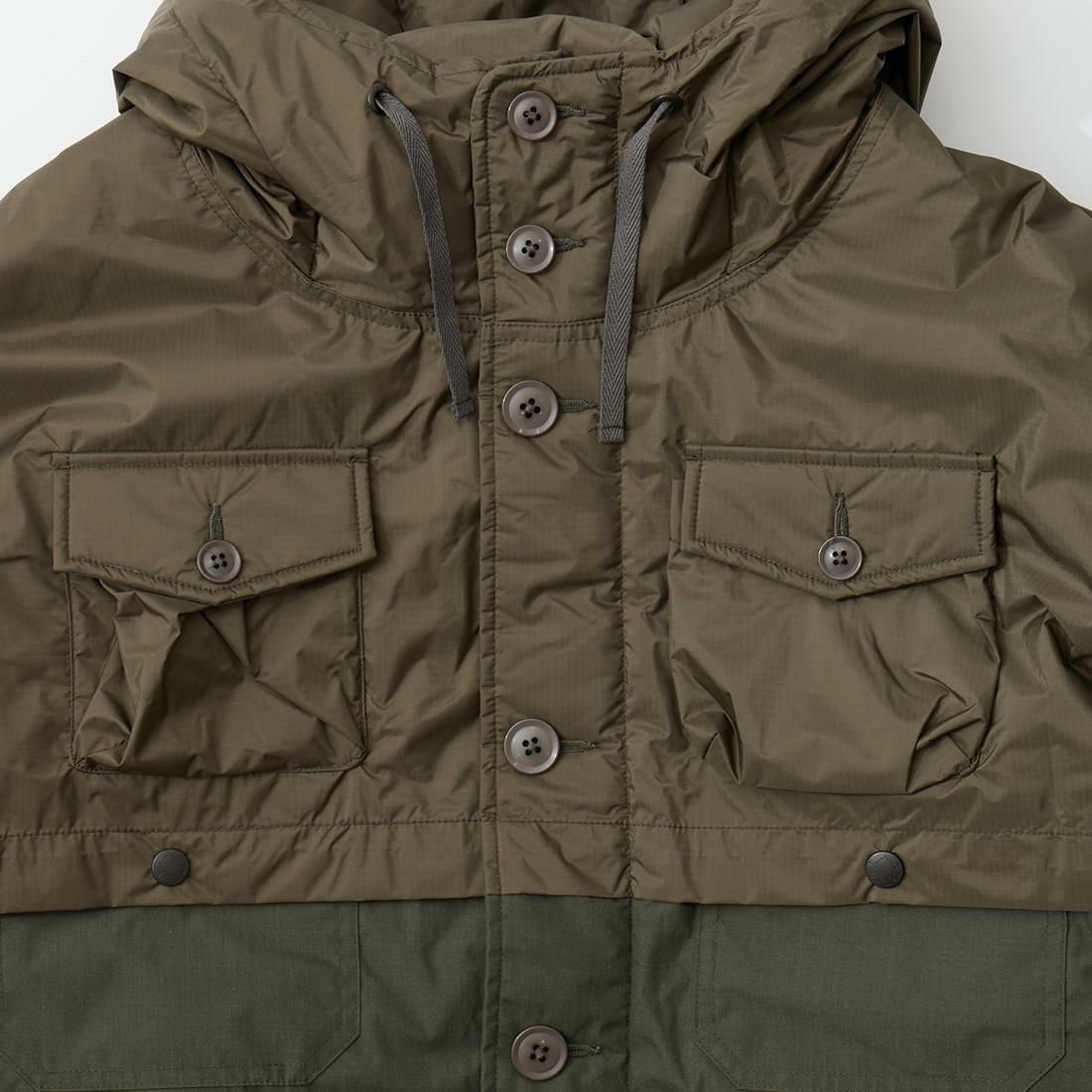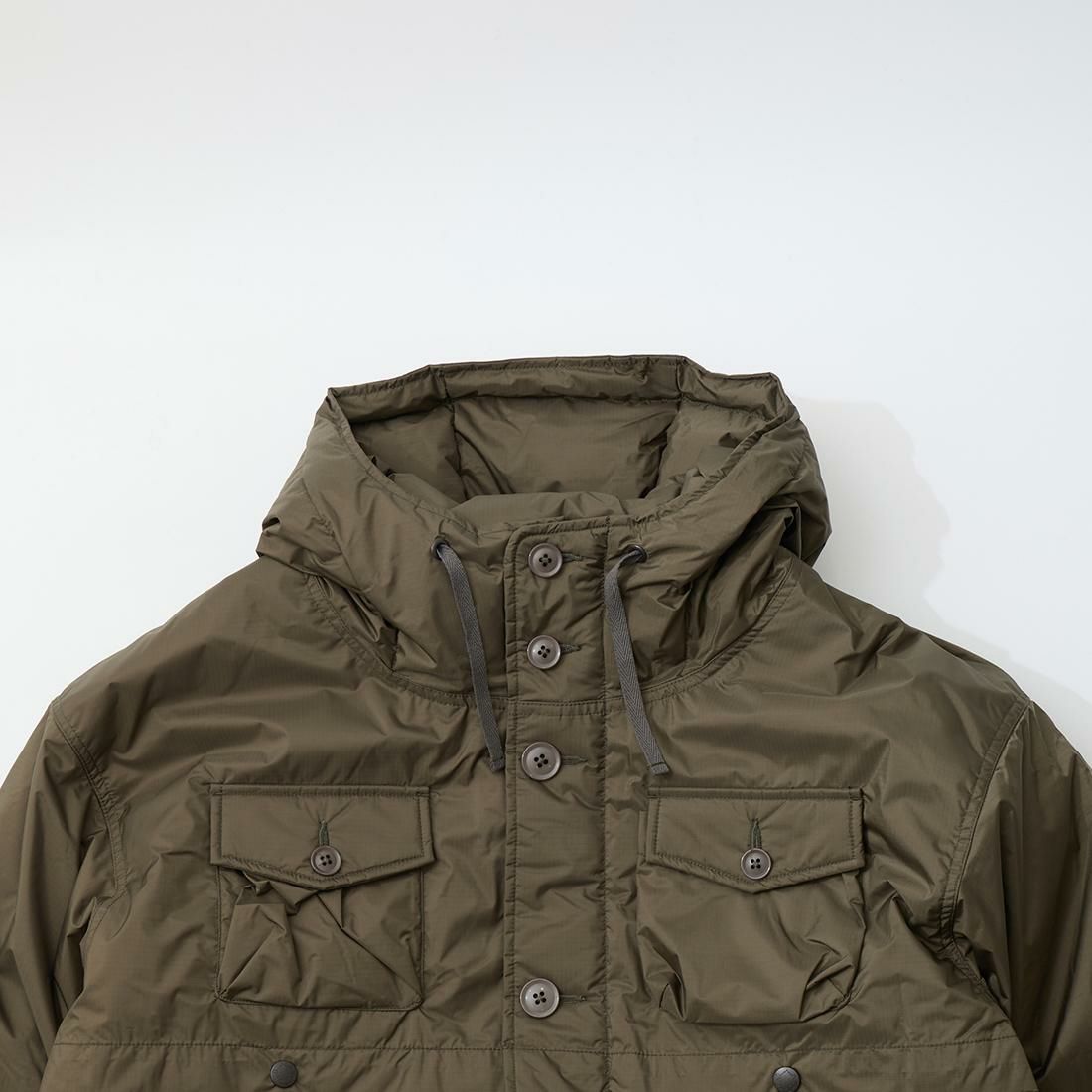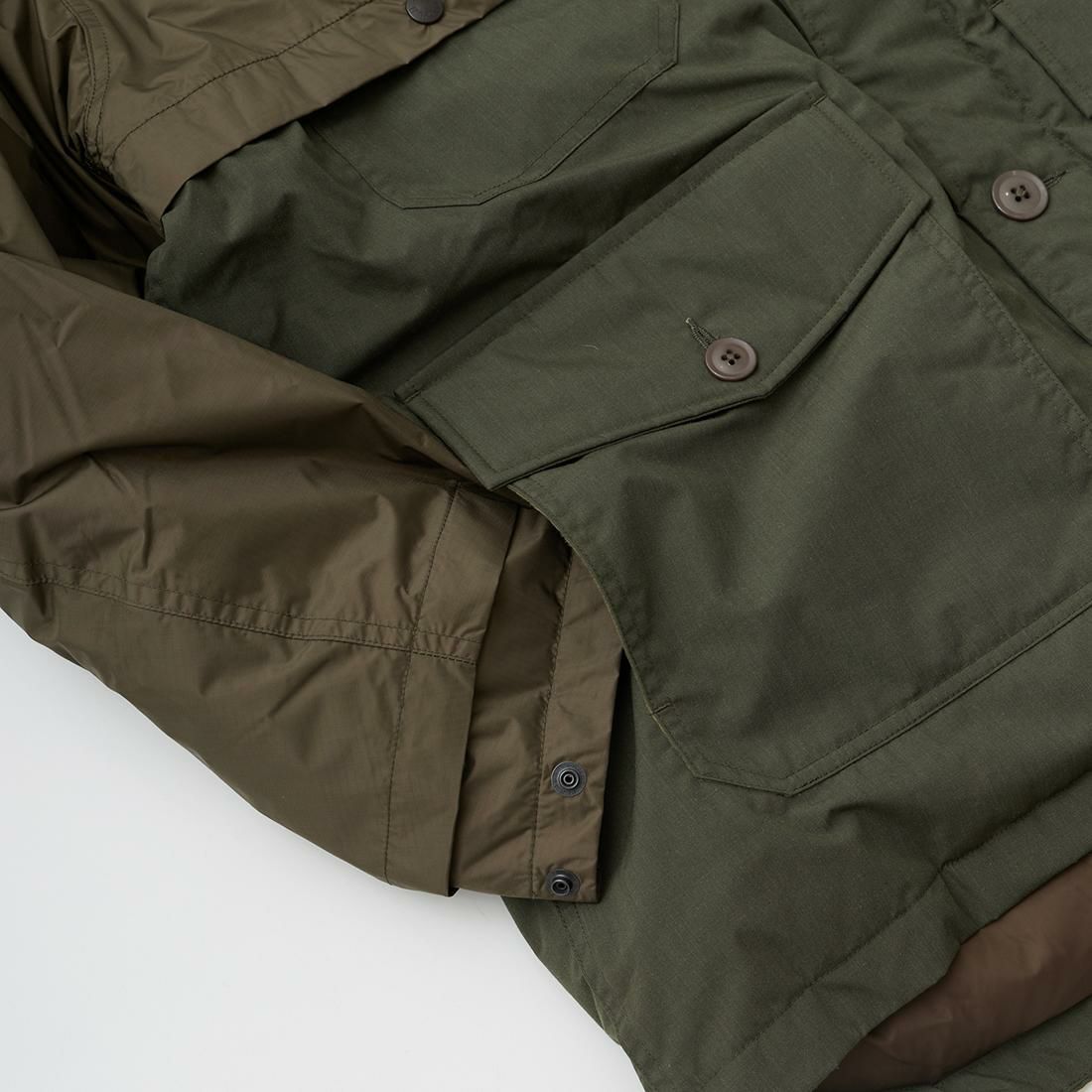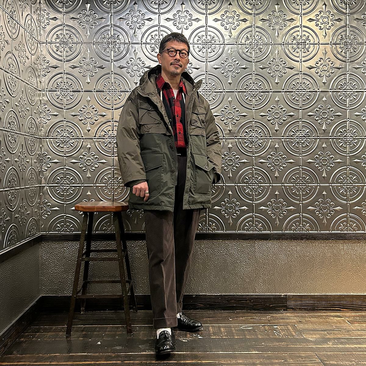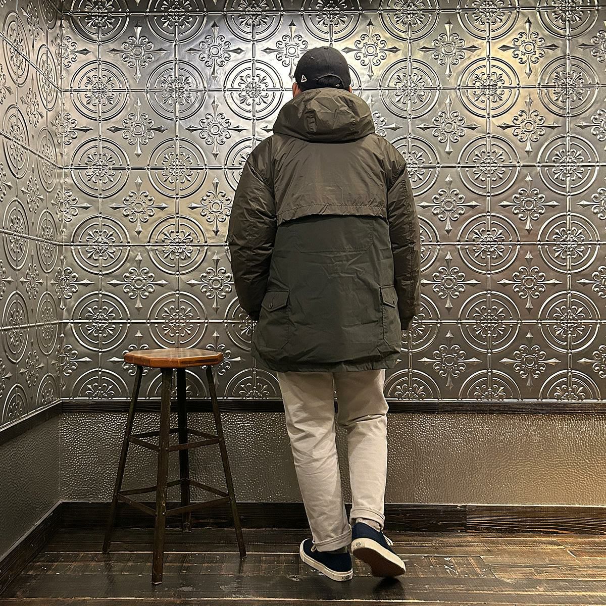MODMNT(モドメント)のSUPER MACKINAW。フィルソンのダブルマッキーノクルーザージャケットがデザインソースのダウンジャケット。フロントに4つの大小のフラップ付きのパッチポケット。バックにも2つのパッチポケット。前立てはジップとボタンの2重構造。肩、胸、背中、腕にかけては2枚仕立ての仕様。袖口はスナップボタンでサイズの調節が可能。表地は防水透湿素材「AURORA-TEX?」と難燃素材「HINOC」を組み合わせたハイブリッド構造。ダウンはスペイン産ホワイトダウン(国内洗浄)を150g封入し、ダウン90%・フェザー10%(760FP)で高い保温性を確保。デザイン性と実用性が両立した完成度の高い1着。