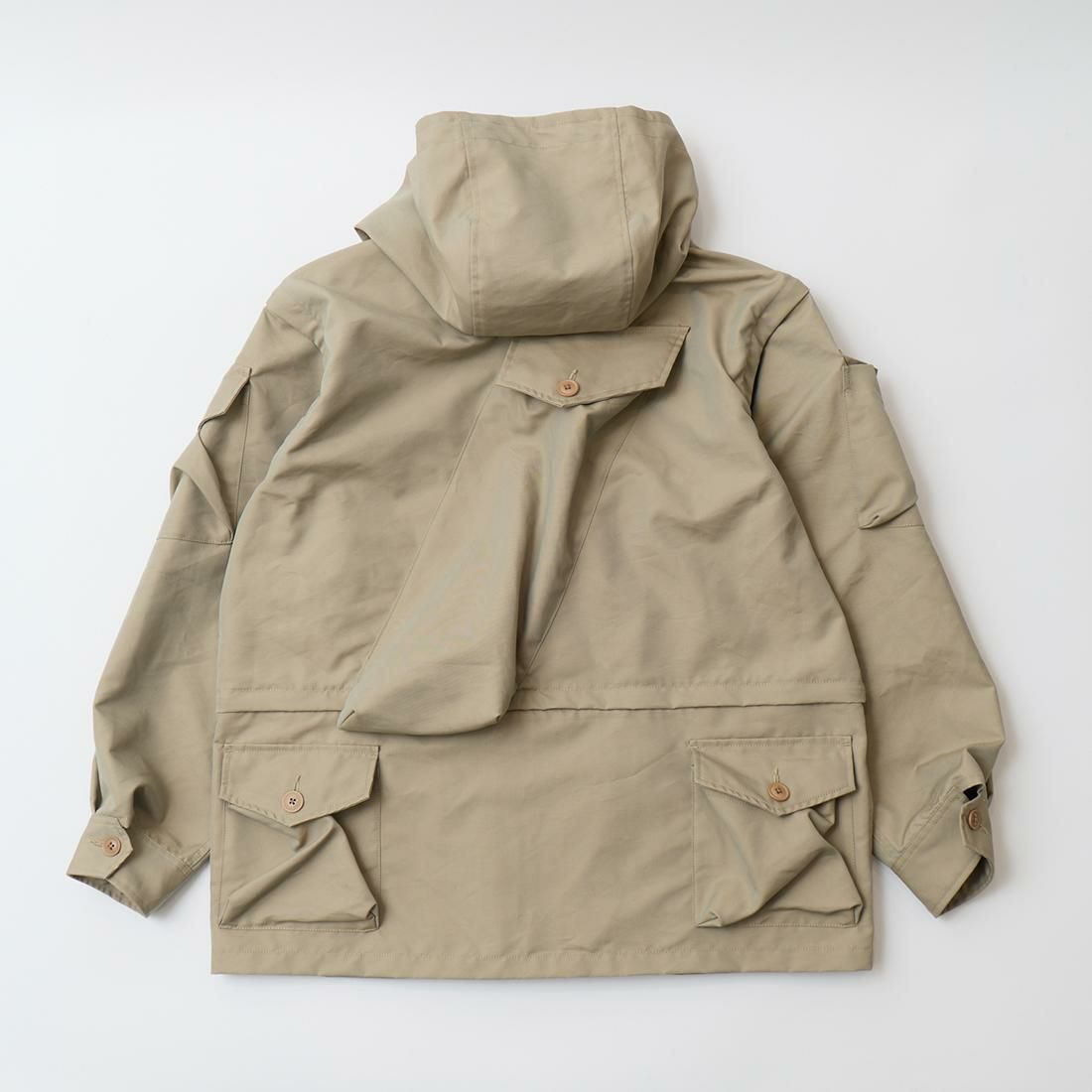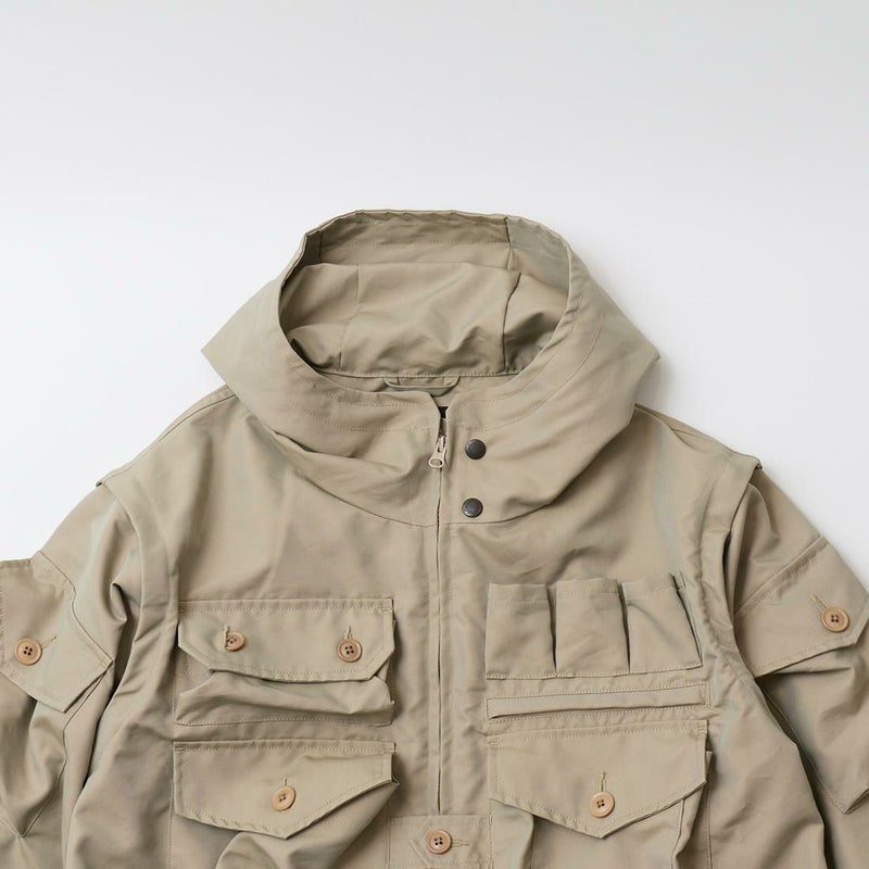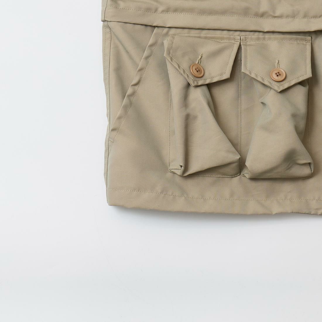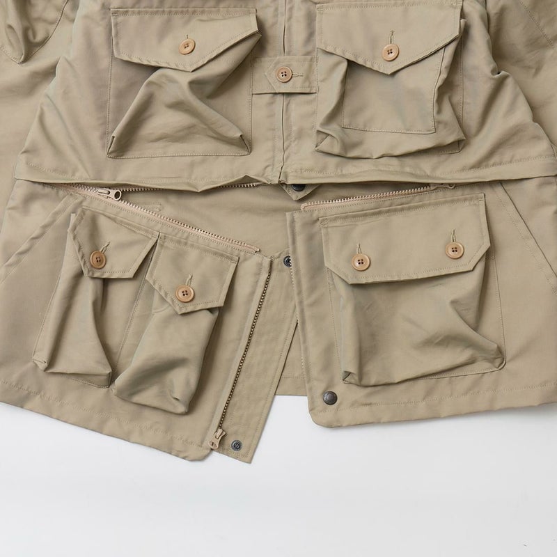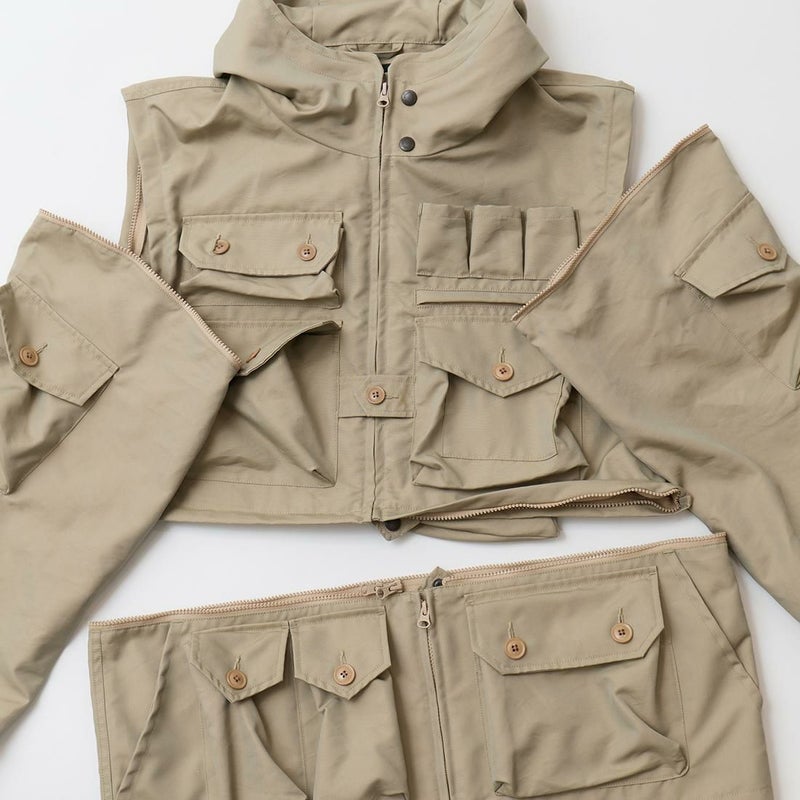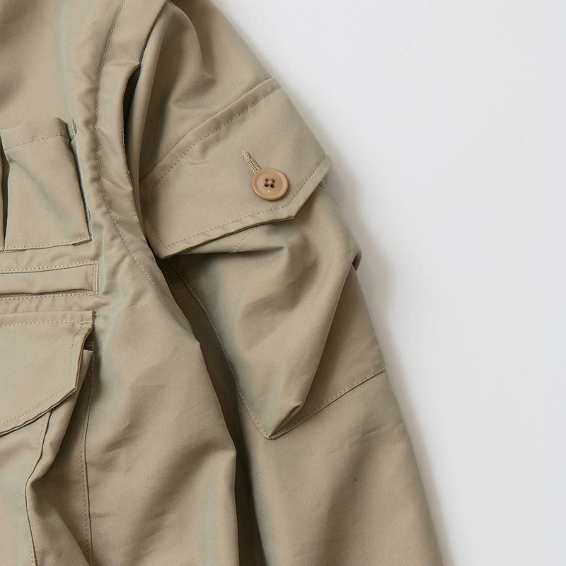 MODMNT(モドメント)のPHOTOGRAPHER JKT。フロントやバックに配置された多数のポケットが特徴的なフォトグラファージャケット。1980年代、中国を旅したアンディ・ウォーホルが着用していたジャケットがデザインソース。前立てはジップフロント。着脱可能なスリーブや着丈の変更が可能。袖を外してベストとしての着用や用途やスタイルに応じて着丈の調整が可能。素材はVENTONE(ベントーネ)を採用。ベントーネはベンタイルの製造技術を応用し、コットンと合繊フィラメントを交織・融合。撥水加工により耐久撥水性を備え、同時に透湿性にも配慮されている機能性の高い素材。