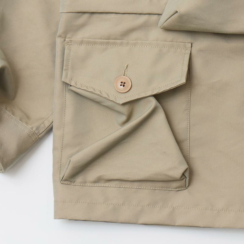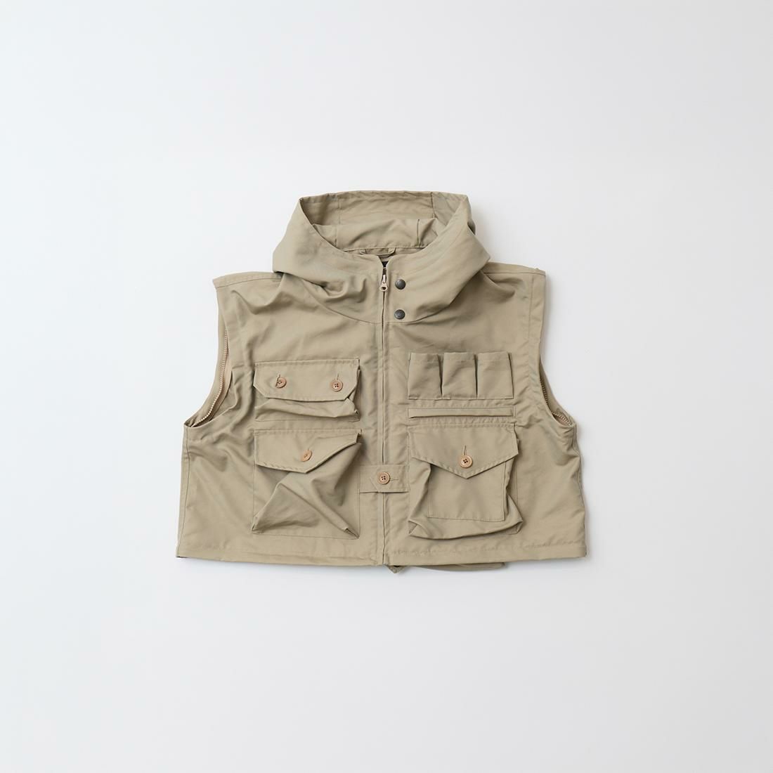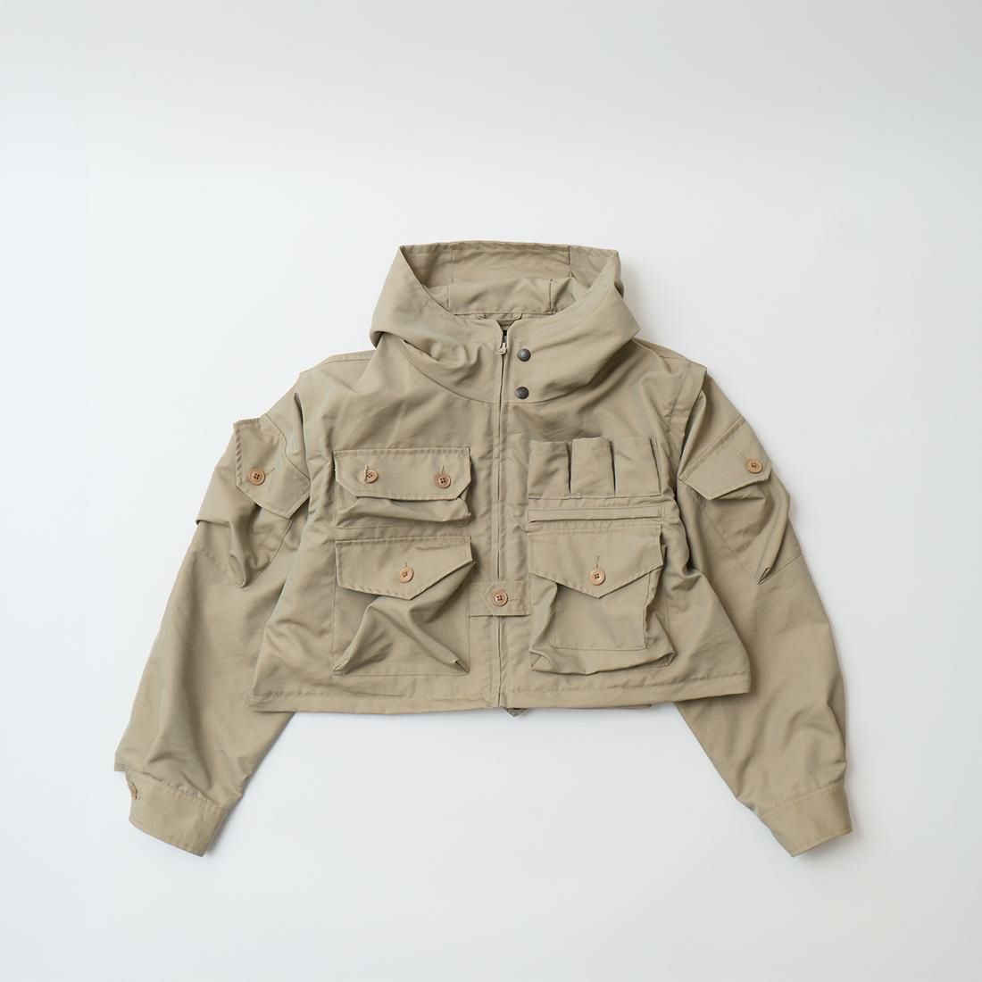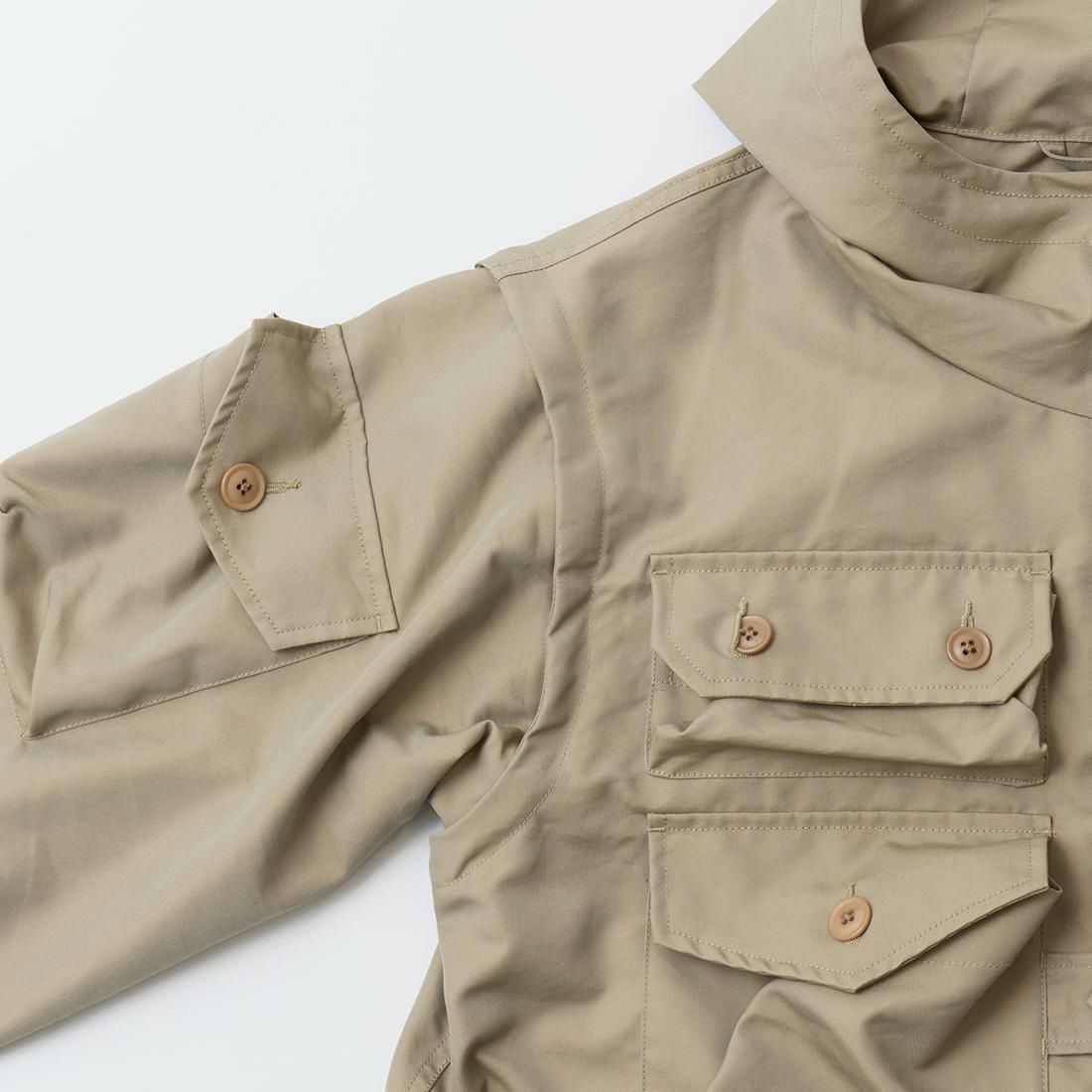 MODMNT(モドメント)のPHOTOGRAPHER JKT。フロントやバックに配置された多数のポケットが特徴的なフォトグラファージャケット。1980年代、中国を旅したアンディ・ウォーホルが着用していたジャケットがデザインソース。前立てはジップフロント。着脱可能なスリーブや着丈の変更が可能。袖を外してベストとしての着用や用途やスタイルに応じて着丈の調整が可能。素材はVENTONE(ベントーネ)を採用。ベントーネはベンタイルの製造技術を応用し、コットンと合繊フィラメントを交織・融合。撥水加工により耐久撥水性を備え、同時に透湿性にも配慮されている機能性の高い素材。
